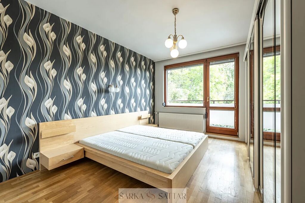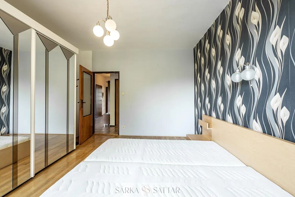 Je zde prostorný obývací prostor 30m2 vybavený sedací soupravou a stolkem a vstupem na balkon, dále dvě ložnice 15m2 a 16m2 s vestavěnými skříněmi, jedna ložnice s manželskou postelí s matracemi a se vstupem na lodžii, koupelna s vanou, umyvadlem a přívodem na pračku, samostatná toaleta, kuchyň má plynovou varnou desku, lednici, mrazák, el.troubu, mikrovlnnou troubu, digestoř, myčku.