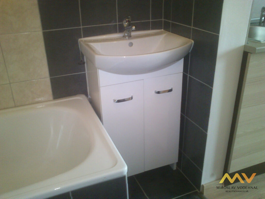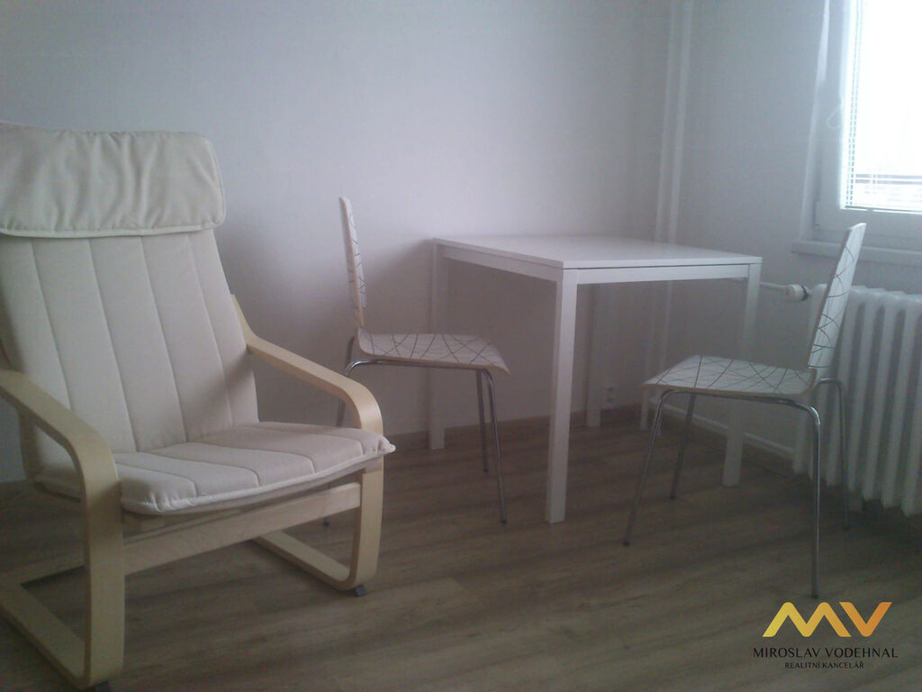 Byt je světlý a útulný, dispozičně řešený jako obývací pokoj s kuchyňským koutem, koupelna s WC a lodžie. Kuchyňská linka je nová a vybavená spotřebiči (malá lednice, elektrický dvojplotýnkový vařič, mikrovlnná trouba), byt je navíc kompletně zařízený – k dispozici je postel, jídelní stůl se židlemi i úložné skříně. Koupelna se zděným jádrem je modernizovaná a nabízí vanu, umyvadlo se skříňkou, toaletu a pračku. Podlahy tvoří PVC a dlažba, plastová okna mají žaluzie. Sklep není k dispozici.