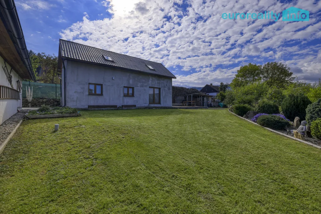 K nemovitosti náleží také prostorná zastřešená terasa 44 m², která je ideálním místem pro letní posezení s rodinou a přáteli. Dále zde naleznete pergolu s krbem, což oceníte při grilování a odpočinku na vzduchu. Dům disponuje zapuštěným bazénem 12 m² se solinátorem, odsuvným zastřešením a solární sprchou, infrasaunou pro relaxaci a dětským domečkem s hřištátkem, což z něj činí ideální místo pro rodinný život. K dispozici je také sklípek o ploše 6 m², akumulační jímka na 1.000 litrů dešťové vody a v zadní části pozemku je rozestavěná stavba.
