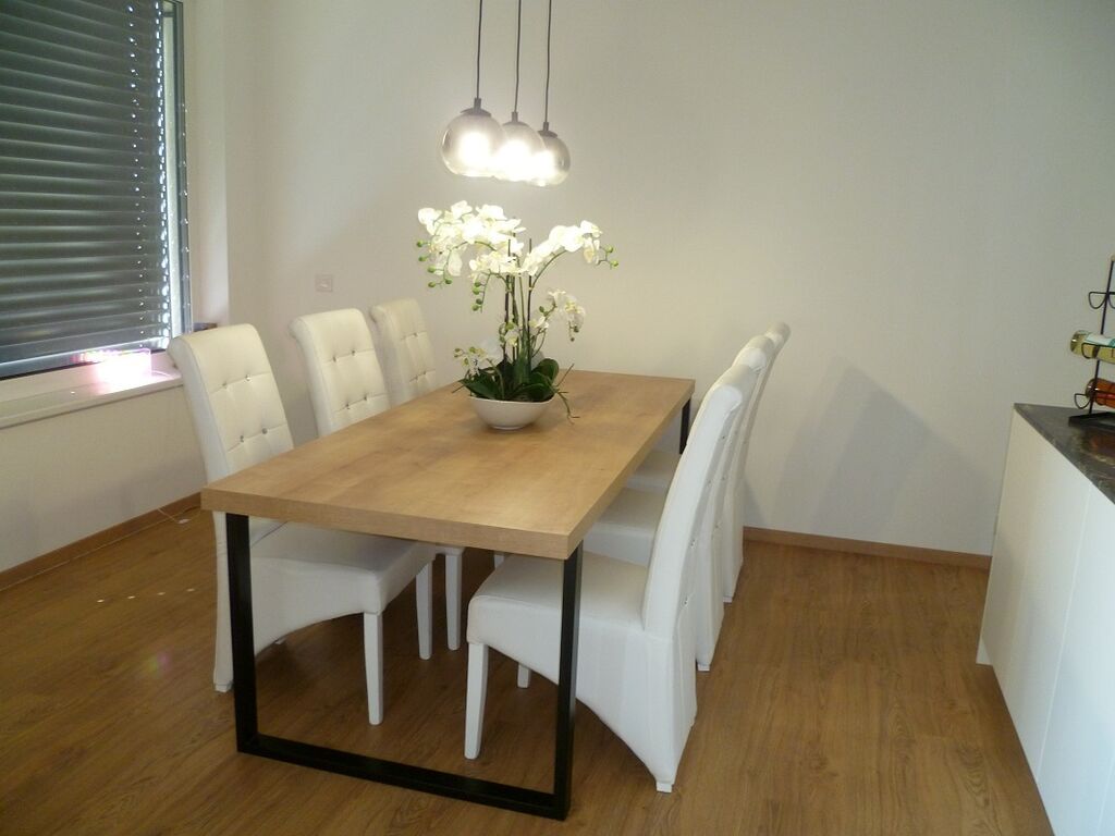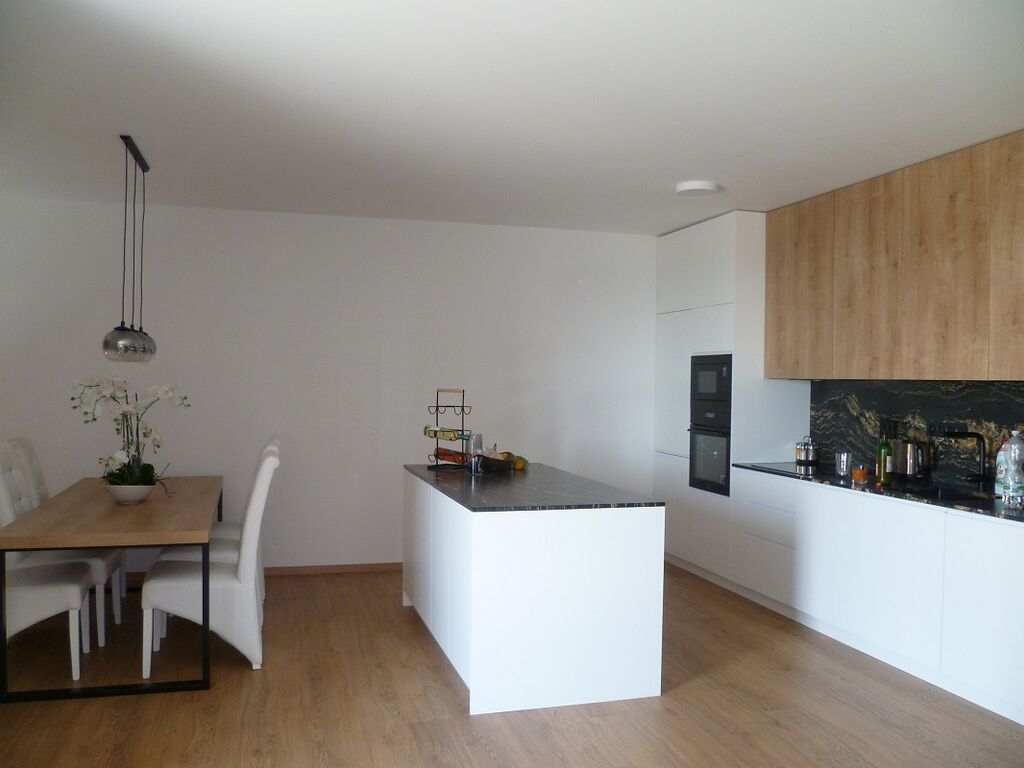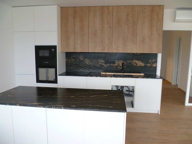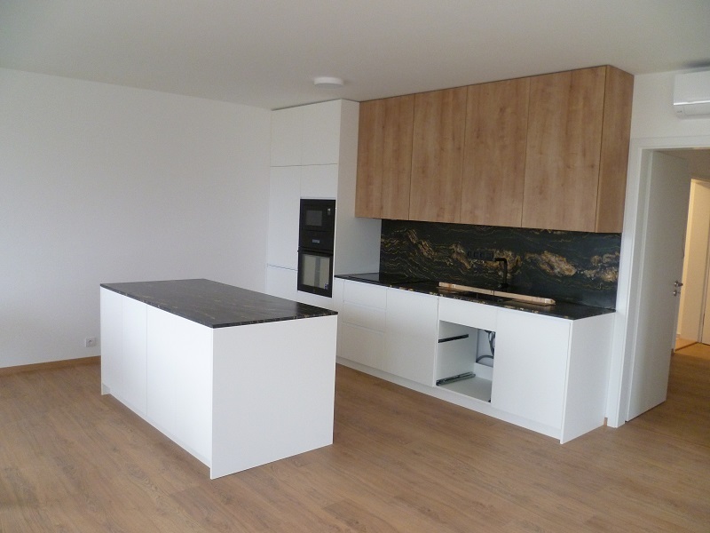 Bytová jednotka vybavená kuchyňskou linkou včetně moderních spotřebičů s nízkou spotřebou a stolem. Kuchyňská deska je vyrobená z přírodního kamene, dovezeného z Ghany.