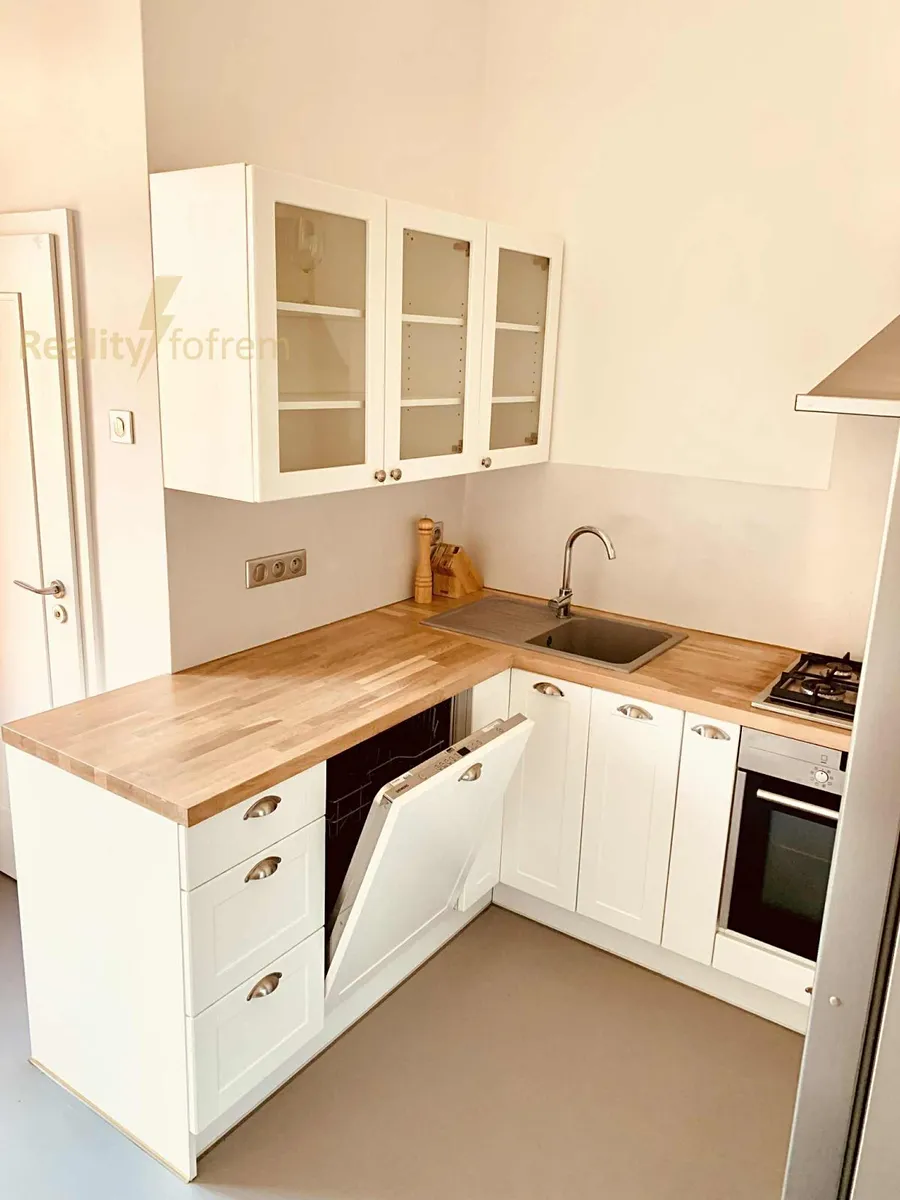Kuchyně s balkonem a výhledem do zeleně je vybavena vestavěnými spotřebiči (myčkou nádobí, elektrickou troubou, digestoří), lednici s mrazákem a dalším úložným prostorem (vestavěnými skříněmi).