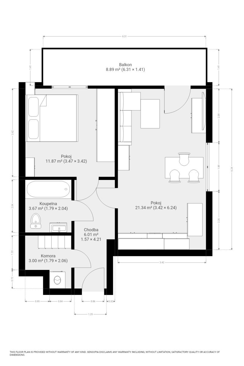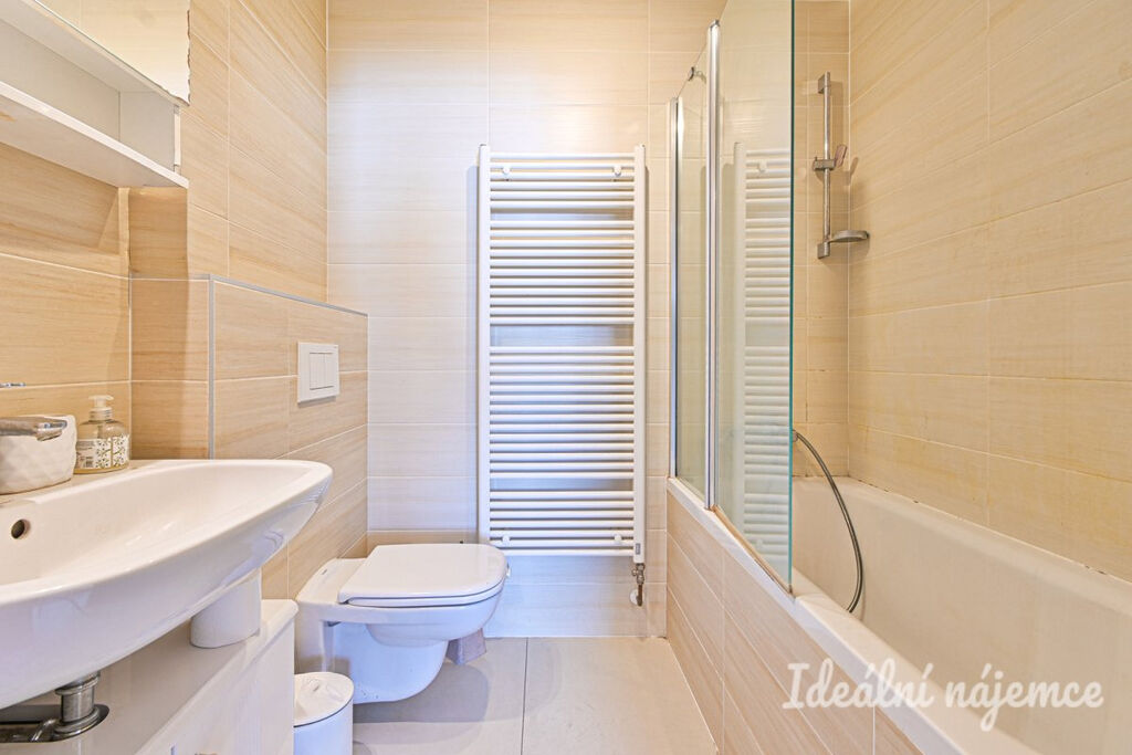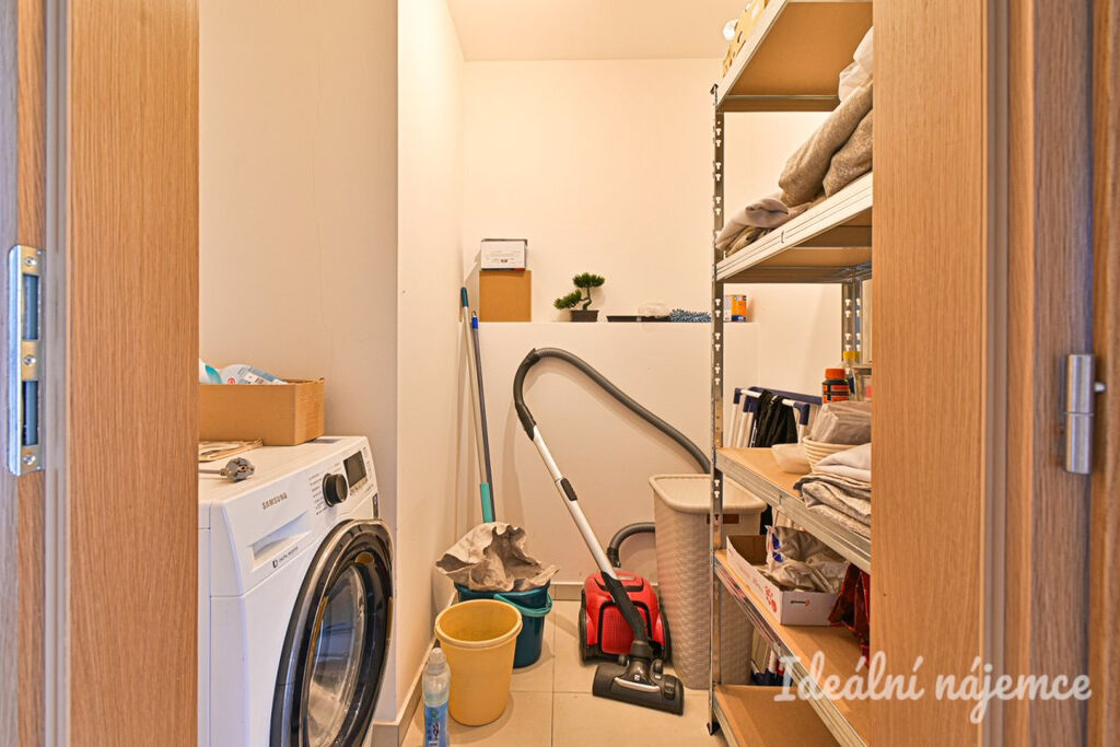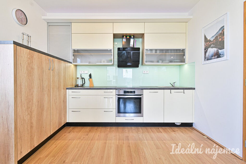 Byt se nabízí plně vybavený dle fotografií. Kuchyně disponuje moderní linkou s vestavěnými spotřebiči – lednicí, myčkou, troubou, varnou deskou, mikrovlnnou troubou a digestoří. Obývací část je zařízena pohodlnou pohovkou, jídelním stolem se židlemi a televizí. Ložnice je vybavena manželskou postelí a šatní skříní. V koupelně se nachází sprchový kout, umyvadlo a toaleta.