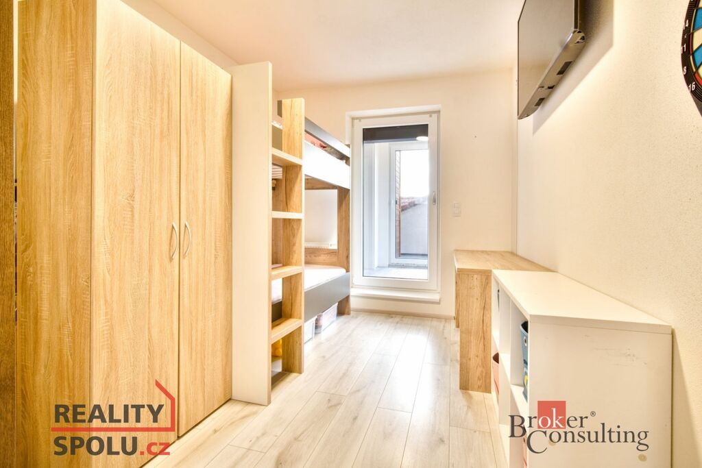 - dispozice bytu byla upravena z původního 3+kk na praktické 4+kk – kromě prostorného obývacího pokoje s kuchyňským koutem zde najdete ložnici, pokoj a třetí samostatný pokoj, který byl přistavěn a lze využít jako pracovnu, dětský pokoj, technickou místnost nebo sklad.