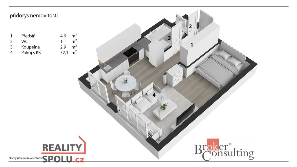Dispozice bytu je velmi praktická – obývací pokoj s kuchyňským koutem je doplněn útulným prostorem pro ložnici odděleným za rohem. K bytu dále náleží předsíň, samostatná koupelna a toaleta. Díky umístění v horním patře působí byt vzdušně a nabízí dostatek denního světla.