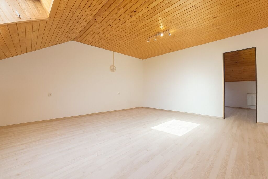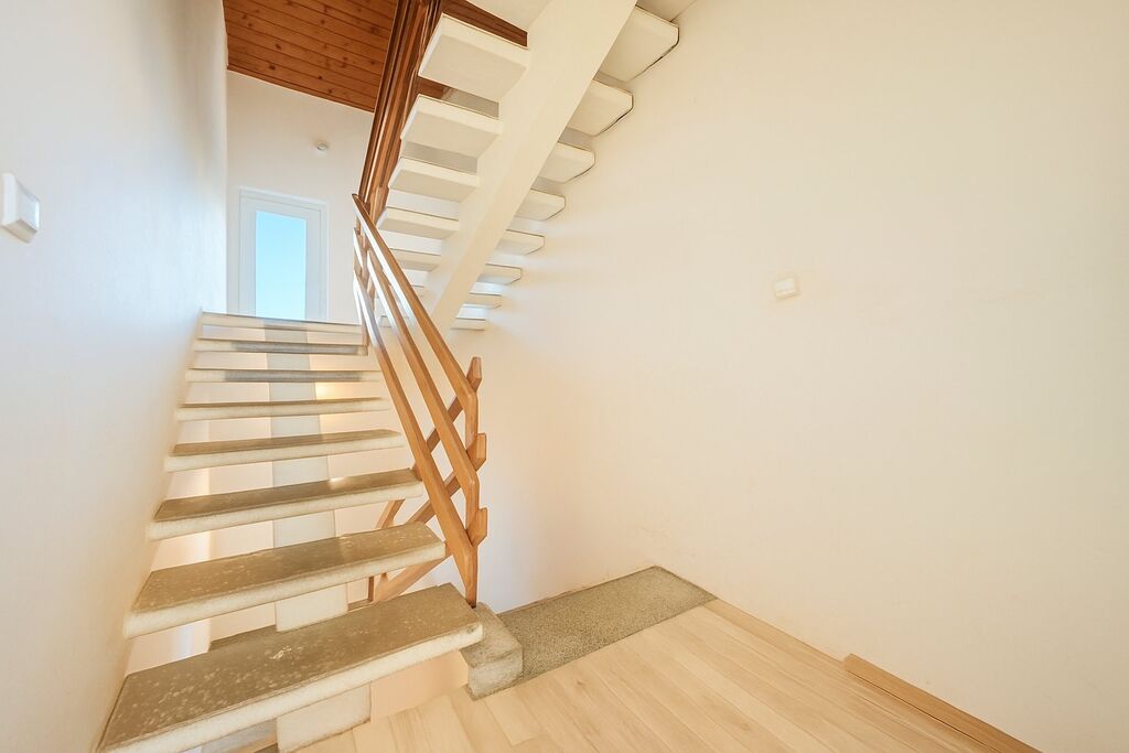 V patře jsou 3 ložnice, z toho dvě mají také vstup na balkon. Podkroví pak nabízí další dva pokoje a druhou koupelnu s WC.