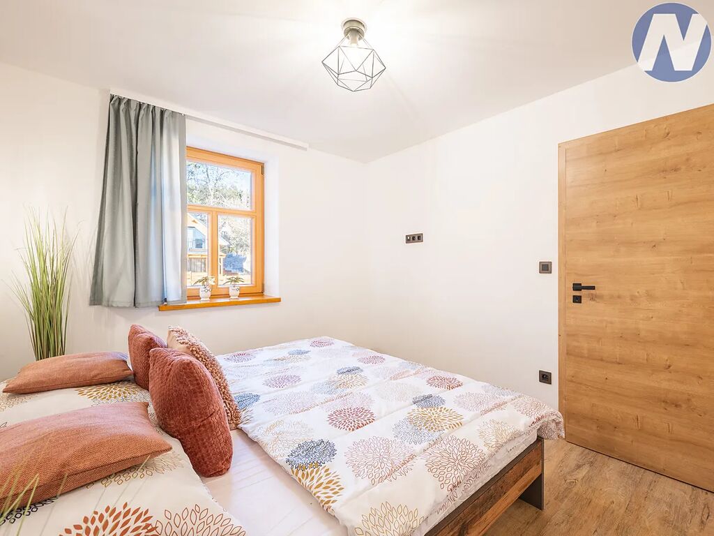 V apartmánu se nachází obývací pokoj s kuchyňským koutem, jídelním stolem a židlemi. Prakticky řešený kuchyňský kout je vybaven lednicí, varnou deskou, troubou na pečení a myčkou na nádobí. V obývacím pokoji je rozkládací sedací souprava, kterou lze v případě potřeby využít jako přistýlku. Dále apartmán disponuje dvěma samostatnými ložnicemi s manželskou postelí. V neposlední řadě je součástí apartmánu koupelna se sprchovým koutem a toaletou. Apartmán má prostorný balkon s posezením a výhledem do přírody a na Lipenské jezero. K apartmánu náleží sklep (lyžárna/úschovna kol) a soukromé parkovací stání. V apartmánu je naistalován bezkontaktní otvírací systém. Součástí areálu je také velký venkovní bazén s odpočinkovou zónou. Apartmán se velmi dobře pronajímá a má již zavedenou stálou klientelu.