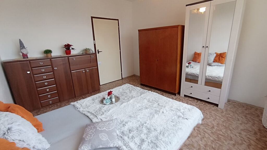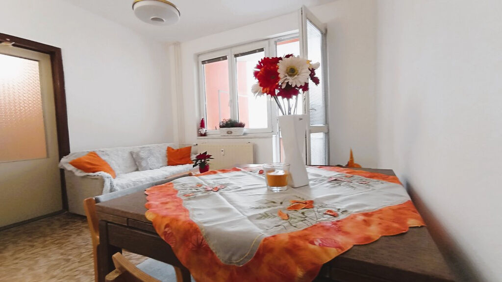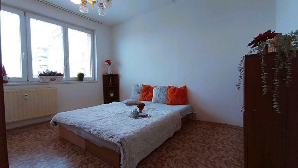 Nabízíme dlouhodobý pronájem bytu 2+kk s balkonem v panelovém domě v klidné části sídliště Máj. Byt o celkové rozloze 42 m2 se nachází v 5 patře celkem z 8 pater. Byt je plně vybavený včetně spotřebičů. Po vstupu do bytu se ocitneme v předsíni, kde jsou k dispozici 2 vestavné skříně a věšák. V ložnici je manželská postel, komoda a dvě skříně. Na okně jsou vertikální žaluzie. Kuchyň je spojena s obývacím koutem, kde je rozkládací gauč konferenční stolek a TV stolek. Dále zde nalezneme rozkládací jídelní stůl se židlemi. Kuchyň je vybavena linkou s potravinovou skříní, sklokeramickým sporákem, digestoří a lednicí s mrazákem. Je zde také vstup na balkon s výhledem do klidného vnitrobloku. V koupelně je sprchový kout, umyvadlo se zrcadlovou skříňkou a pračka. K bytu dále náleží 2 sklepy v přízemí domu.