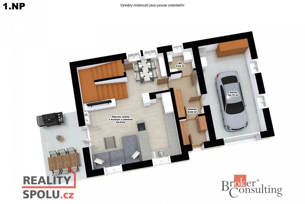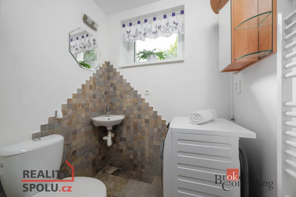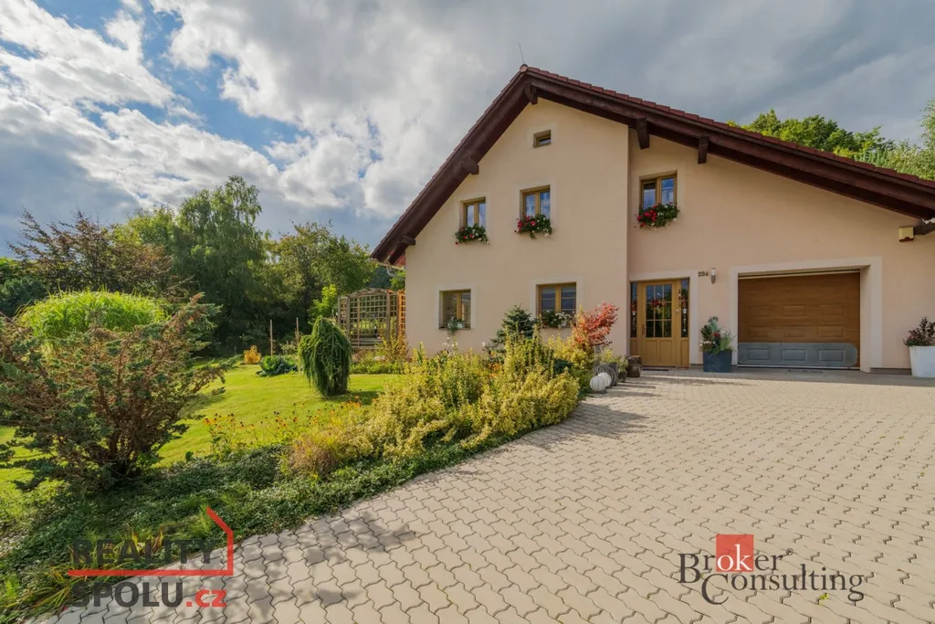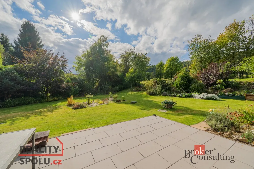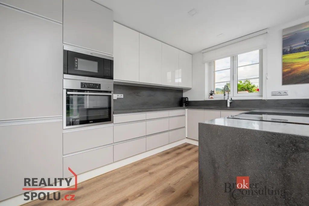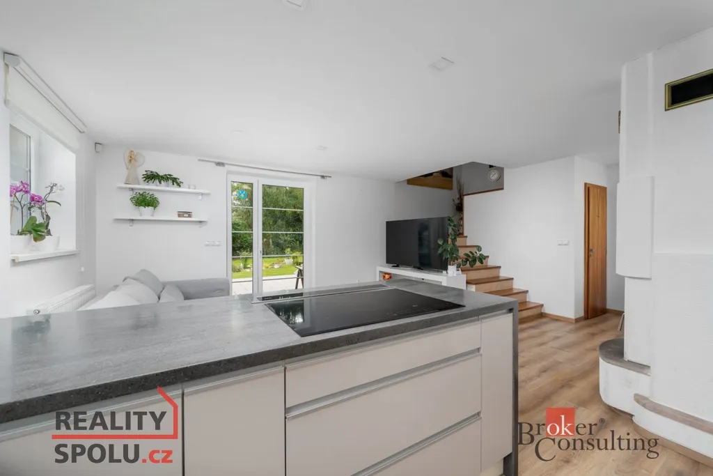 Dominantou domu je velkorysý, světlý obývací pokoj s krbem, plynule propojený s moderním kuchyňským koutem vč. spotřebičů a přímým vstupem na nově vybudovanou terasu, kde si užijete posezení s výhledem do zeleně.