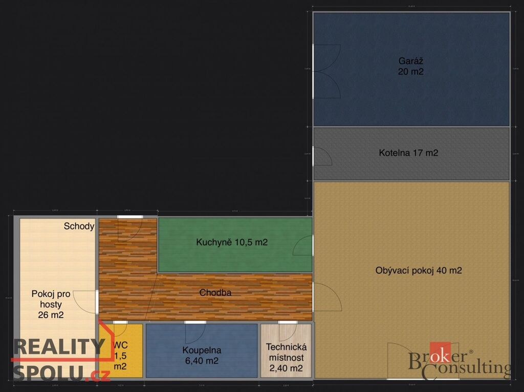 prostorný obývací pokoj s krbovými kamny a pecí, kuchyně, pracovna – pokoj pro hosty s dřevěným schodištěm do podkroví, koupelna se sprchou i vanou a samostatné WC, úklidová místnost. V přístavbě do tvaru „L“ je technické zázemí (tepelné čerpadlo, darling, sklad dřeva) a garáž.