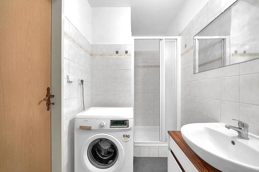 V koupelně je vkusný sprchový kout s umyvadlem a místem na pračku, která nebude součástí vybavení.