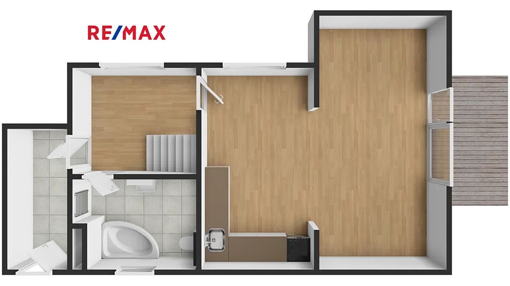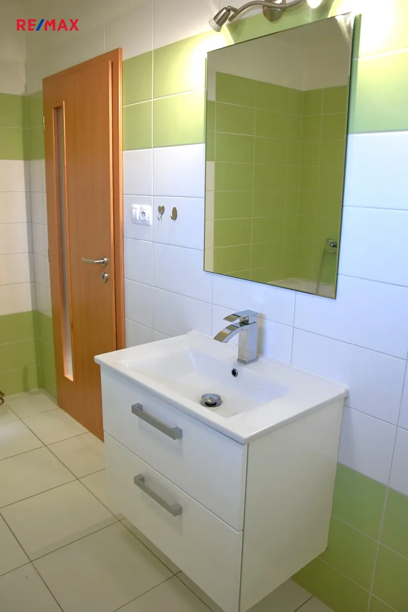 1. NP - vstupní předsíň, chodba se schodištěm do 2. NP, kuchyně, obývací pokoj se vstupem na terasu a zahradu, prostorná koupelna s WC.