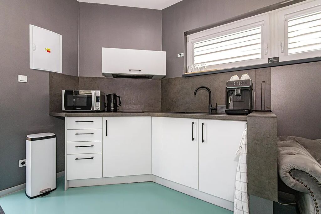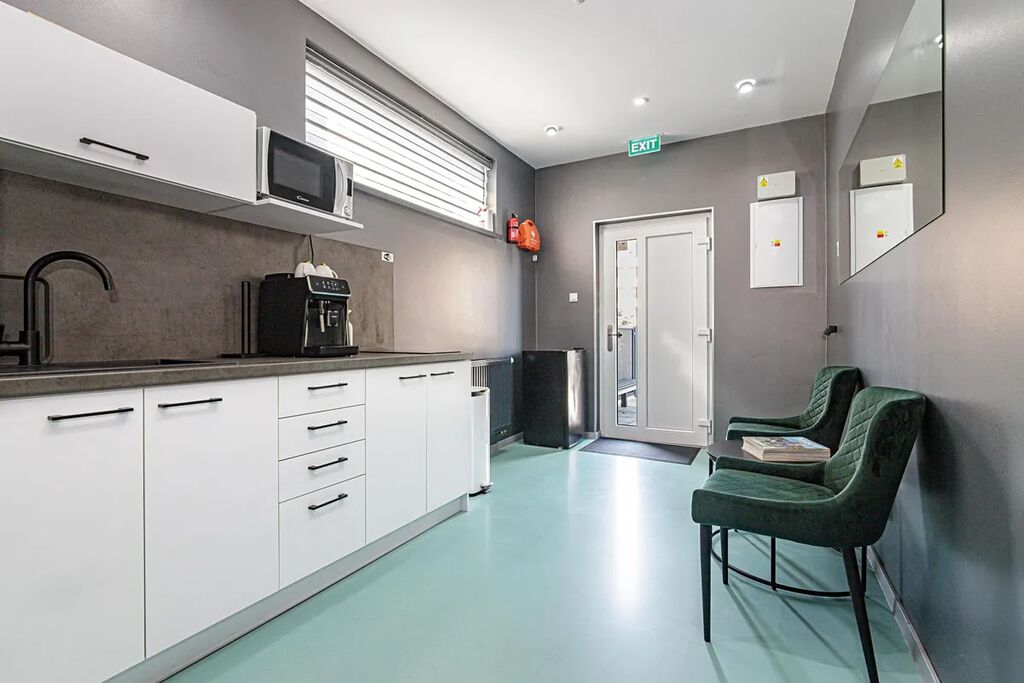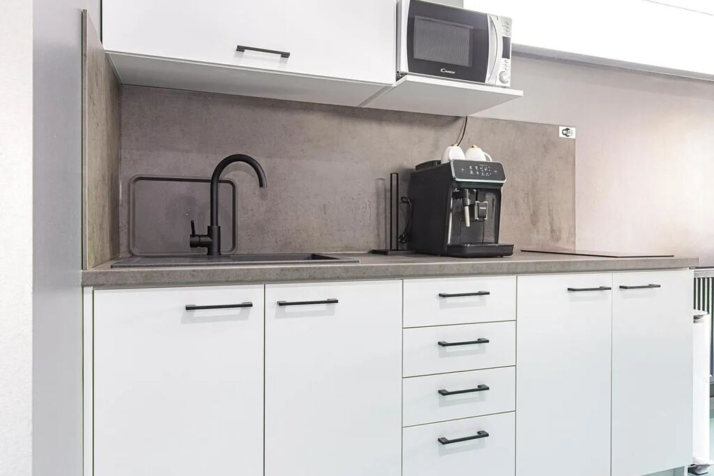 Na každém patře se nachází plně vybavená kuchyňka s varnou deskou, lednicí, rychlovarnou konvicí, mikrovlnou troubou a kávovarem.
