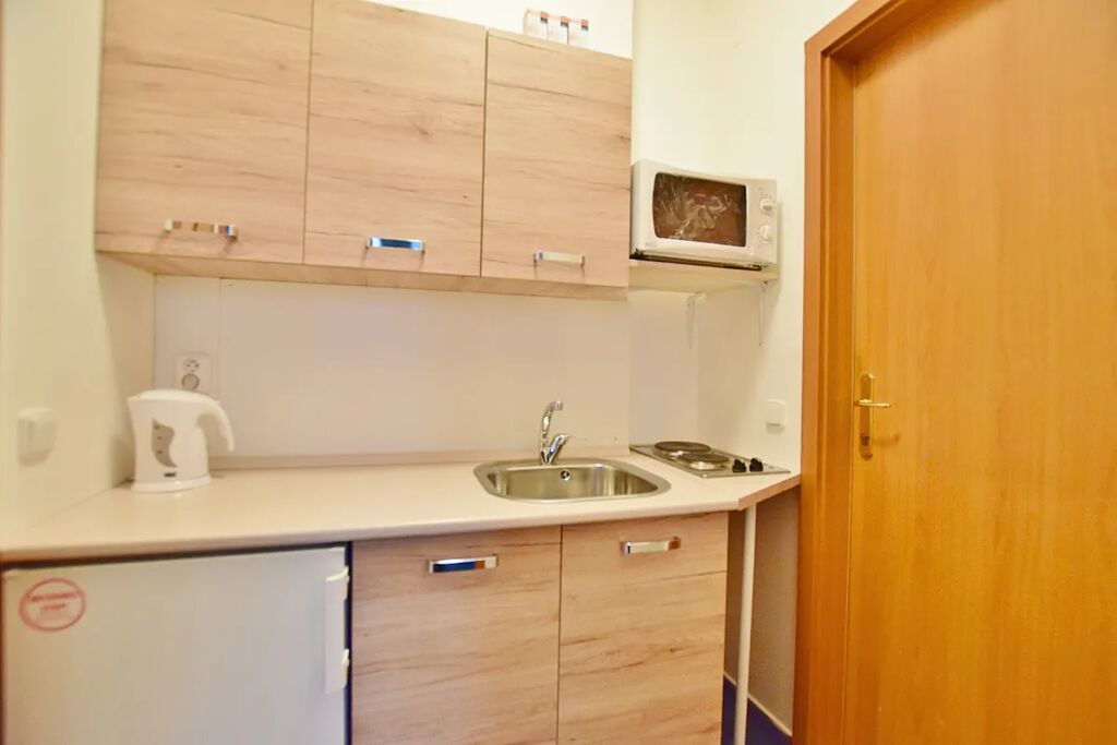 • kuchyňská linka se spotřebiči (lednice, dvouplotýnkový elektrický vařič, mikrovlnná trouba, rychlovarná konvice)