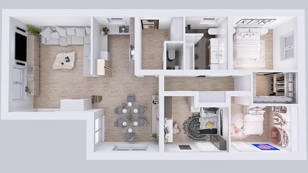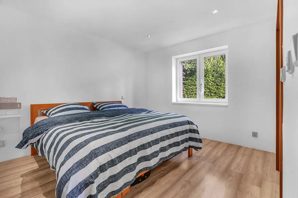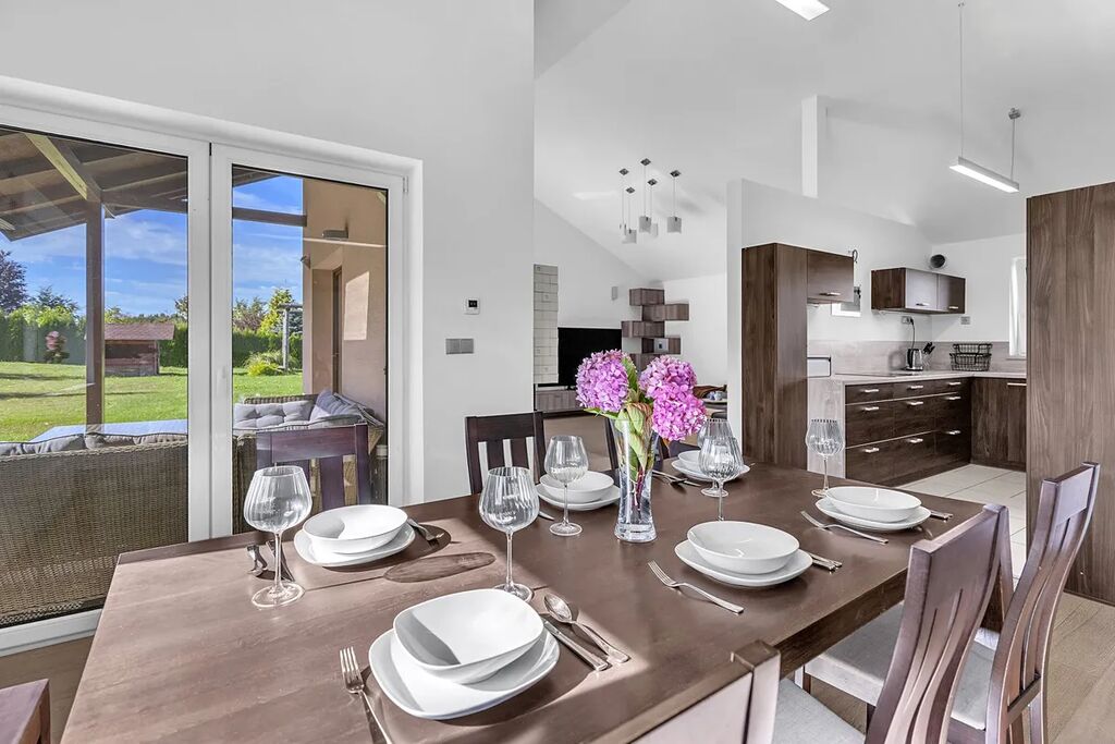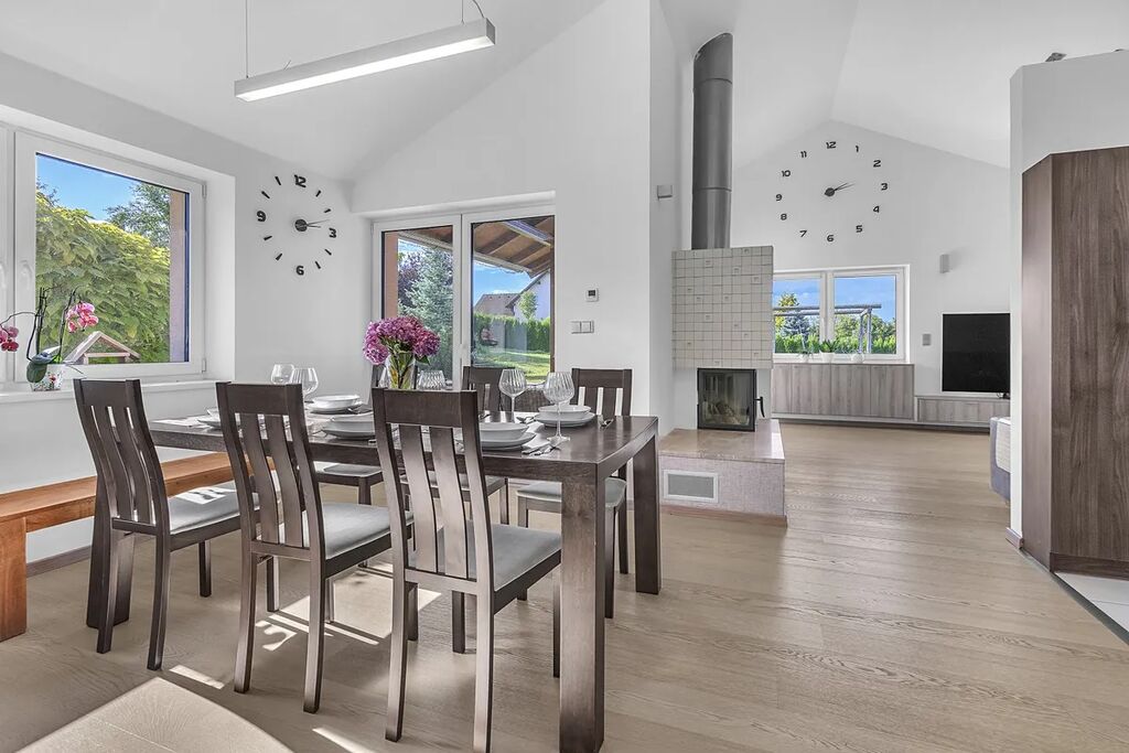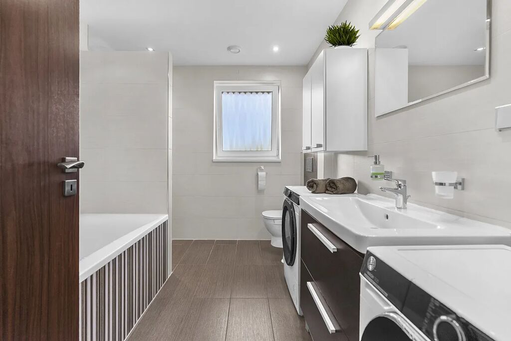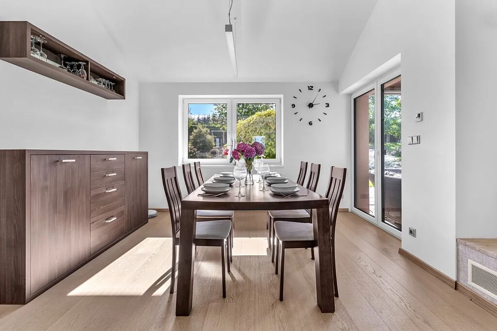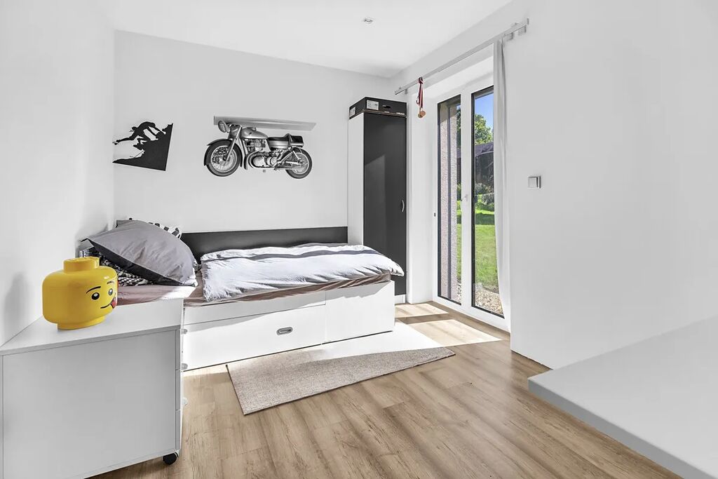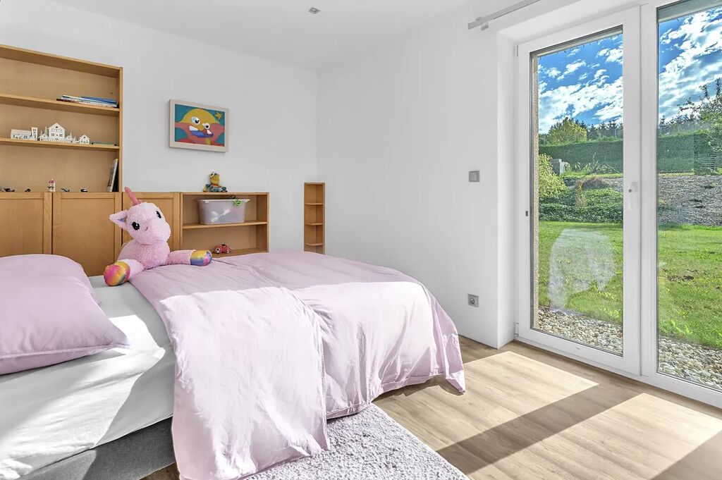 Dispozice - vstupní chodba s úložnými prostory na míru, samostatné WC s umyvadlem, centrální prostor se vstupem na terasu je rozdělen na obývací část, jídelnu a kuchyň, 2 dětské pokoje se vstupem do zahrady, ložnice s šatnou, koupelna s vanou, sprchovým koutem a WC.