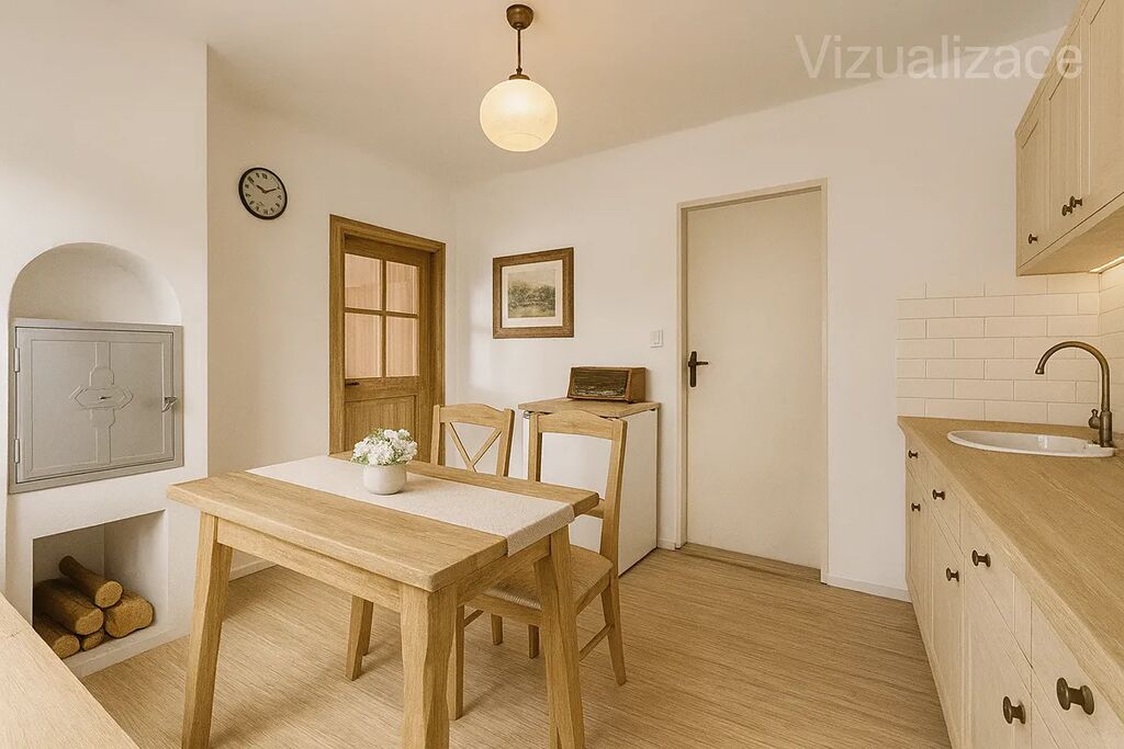 Srdcem celého domu jsou původní keramická kamna v obývacím pokoji a dvojkamna v kuchyni. Dříve se v nich nejen topilo, ale také vařilo a peklo. I dnes dokážou vykouzlit tu pravou rodinnou atmosféru – představte si, jak v zimních večerech praská oheň a celým domem se line vůně čerstvě upečených buchet. Revize komína proběhla před dvěma lety, takže jejich užívání je bezproblémové a bezpečné.