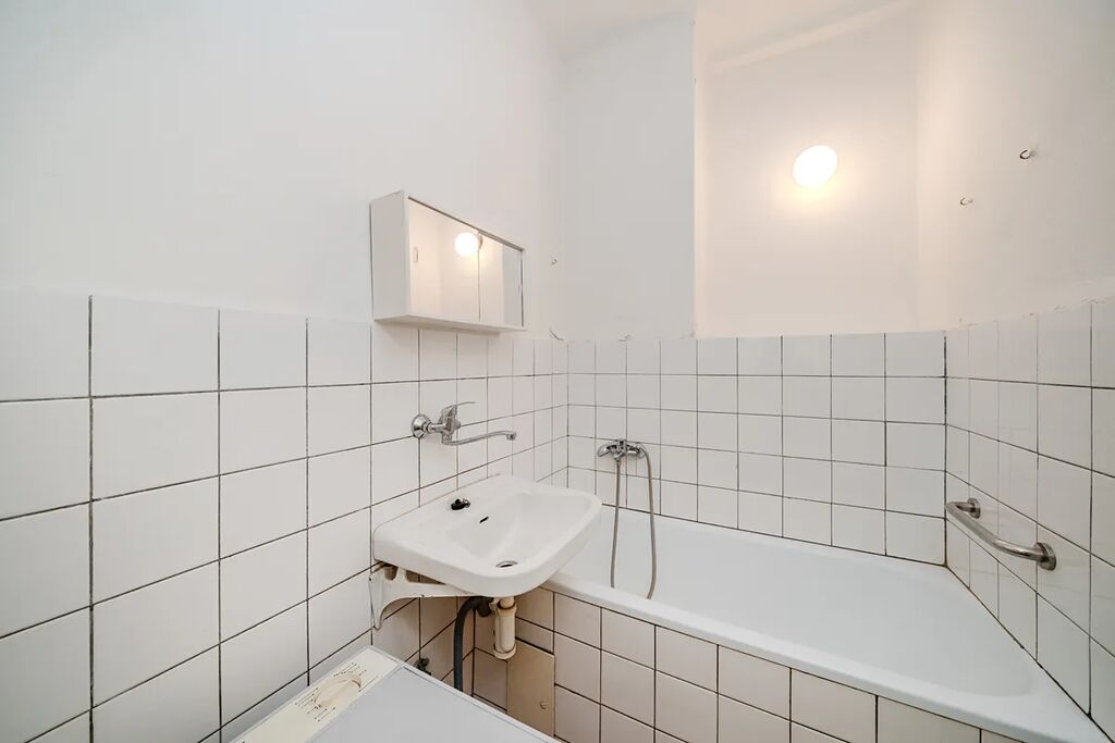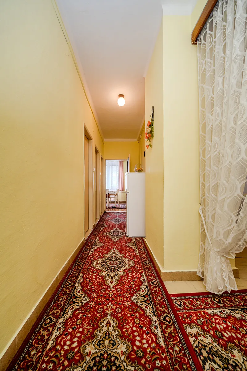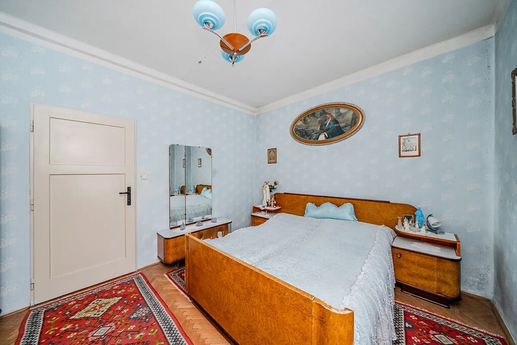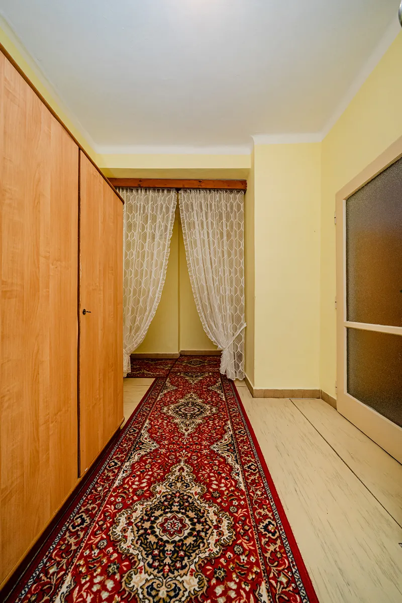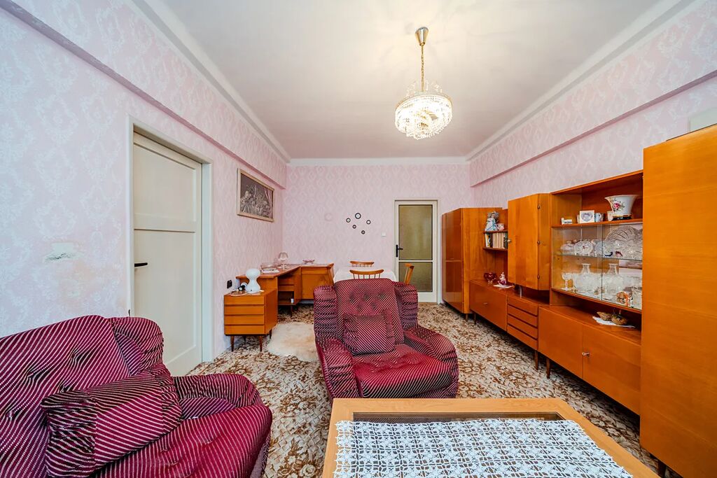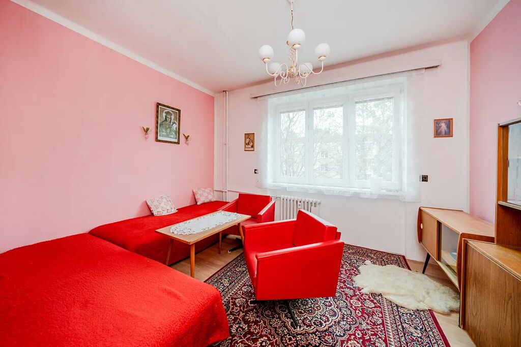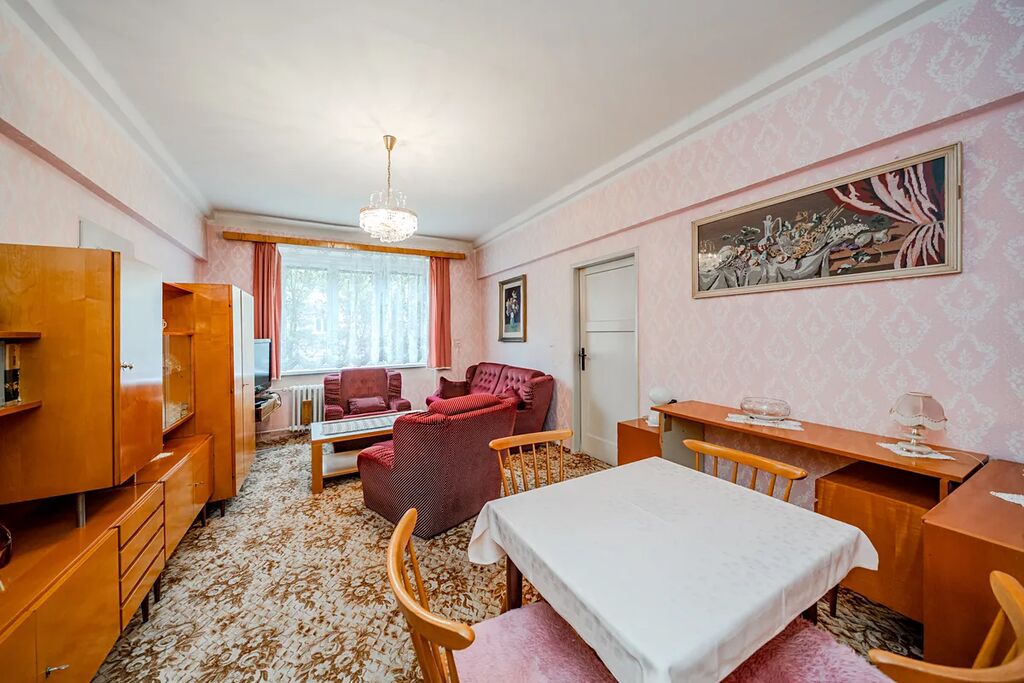 Byt má prostornou chodbu, zděnou koupelnu s vanou a samostatnou toaletu. Kuchyně je průchozí s obývacím pokojem. V budoucnu bude z obývacího pokoje vstup na balkon. Obývací pokoj je průchozí s ložnicí. Další pokoj je samostatný. Rozvody elektra jsou původní v hliníku. Omítky v bytě jsou původní. Podlahy jsou pokryté linoleem, pod nim jsou původní parkety.