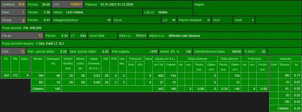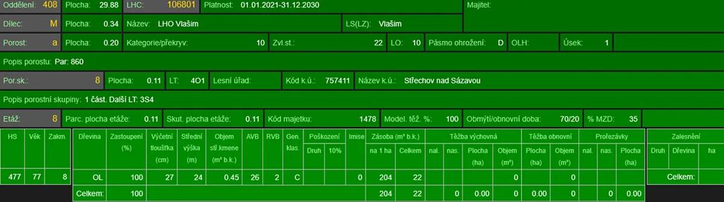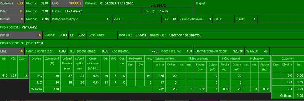 - p.č. 664/2 o celkové výměře 886 m2 vedená jako lesní pozemek (stáří lesa 139 let - zastoupení dřevin je borovice, modřín)