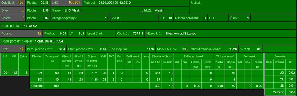 - p.č. 847/2 o celkové výměře 345 m2 vedená jako lesní pozemek (stáří lesa 116 let - zastoupení dřevin je smrk, borovice),