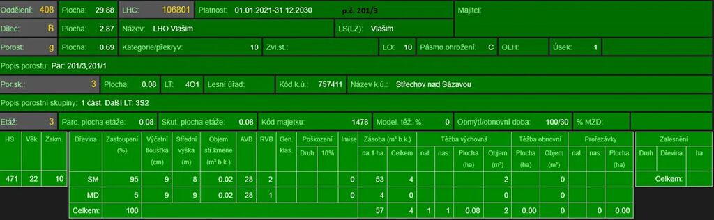 - p.č. 201/3 o celkové výměře 2 553 m2 vedená jako lesní pozemek (stáří lesa 116 let- zastoupení dřevin je smrk, borovice, modřín, stáří lesa 26 let - zastoupení dřevin smrk, modřín)- starý porost vytěžen po kalamitní těžbě,