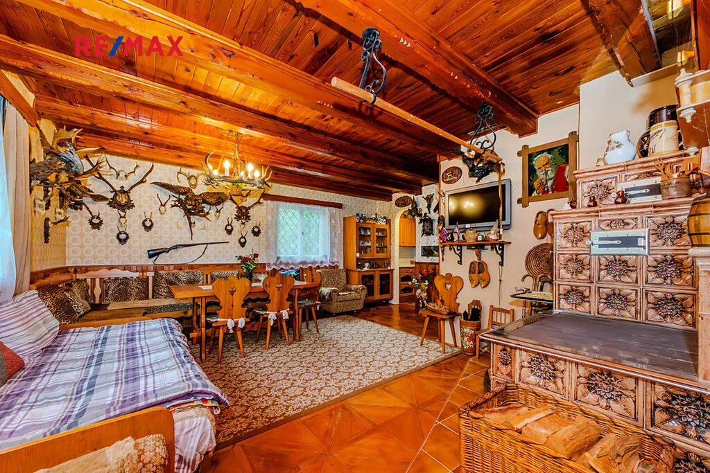 Přízemí: Vstup přes verandu do prostorného obývacího pokoje s krásnými kachlovými kamny a kuchyňským koutem, samostatné WC, koupelna a další pokoj pro hosty nebo kancelář.