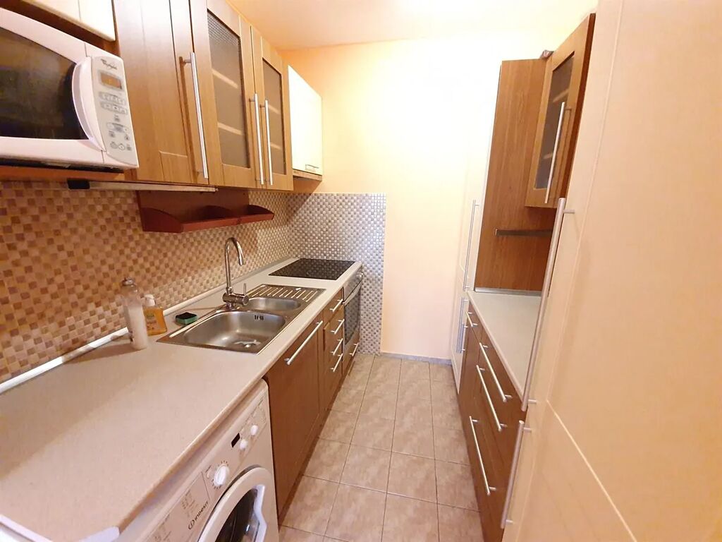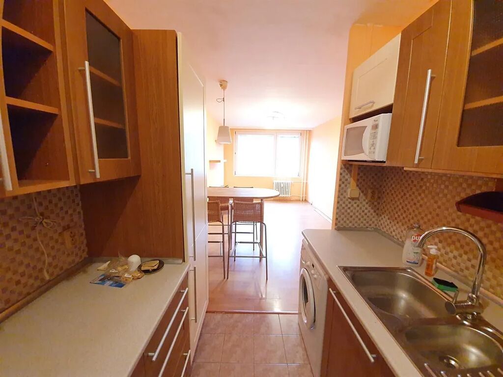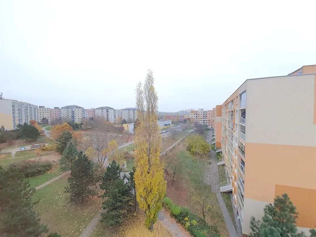 Pěkný světlý a slunný byt 2+kk 45 m2, Praha 9 - Černý Most, ul. Generála Janouška. 6. patro - výtah, sklep, orientace na jih, nezařízený - kuchyň, pračka, sporák, lednice, mikrovlnka, vestavěné skříně, plovoucí podlaha, koupelna s vanou, toaleta samostatně, výhled do otevřeného prostranství se zelení.