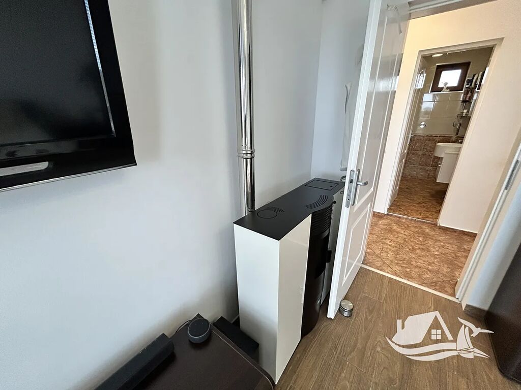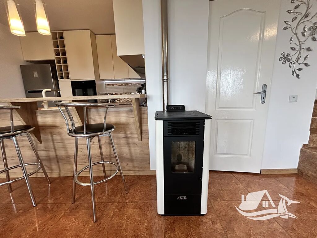 Pro vytápění a komfort domácnosti slouží dvě peletyové topidla a klimatizace v jednotlivých místnostech. Okolí domu je pečlivě udržováno – zahrada je upravená a po celém pozemku vede vydlážděná cesta.