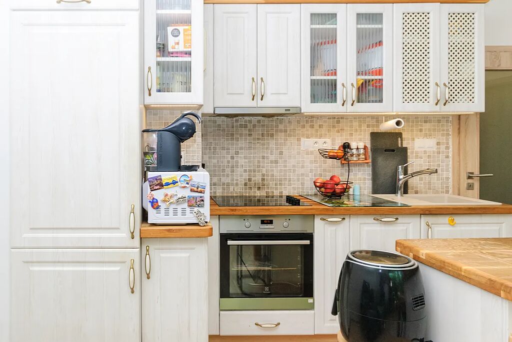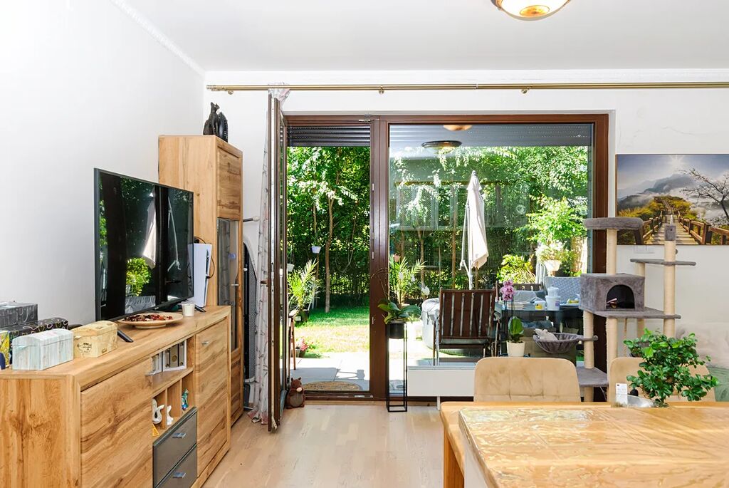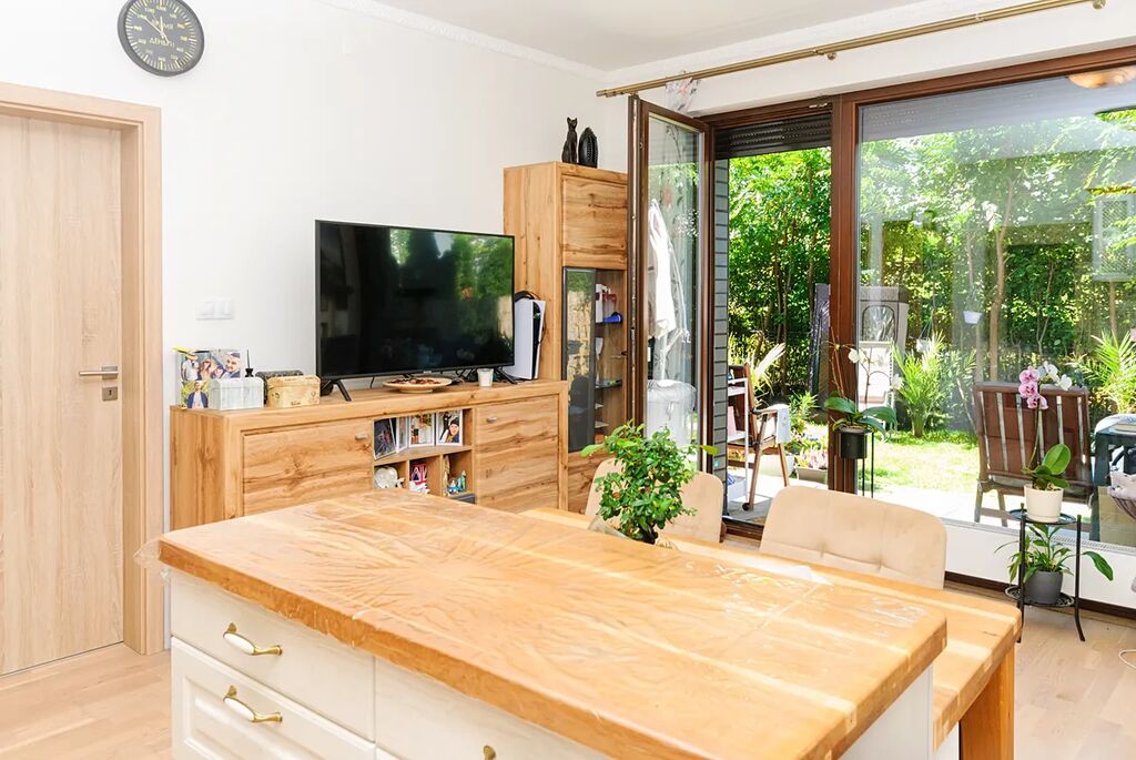 Obývací pokoj s kuchyňským koutem (21,8 m²), orientovaný na severozápad, je světlý a vzdušný, s přímým vstupem na terasu a zahrádku (63 m²), které poskytují ideální místo pro relaxaci, posezení s přáteli i dětské hry. Kuchyňský kout je plně vybaven všemi spotřebiči: indukční varná deska, digestoř, elektrická a mikrovlnná trouba a myčka nádobí.