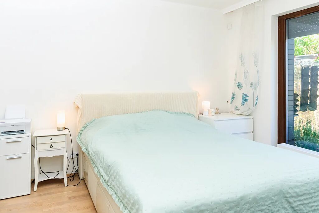 Ložnice (16,2 m²) je zařízena manželskou postelí a šatní skříní. V předsíni se nachází velká vestavěná skříň na míru, která poskytuje spoustu úložného prostoru. Koupelna (5,2 m²) je vybavena vanou, umyvadlem a toaletou. K bytu náleží také sklep (1,9 m²) a vlastní parkovací stání v podzemní garáži.