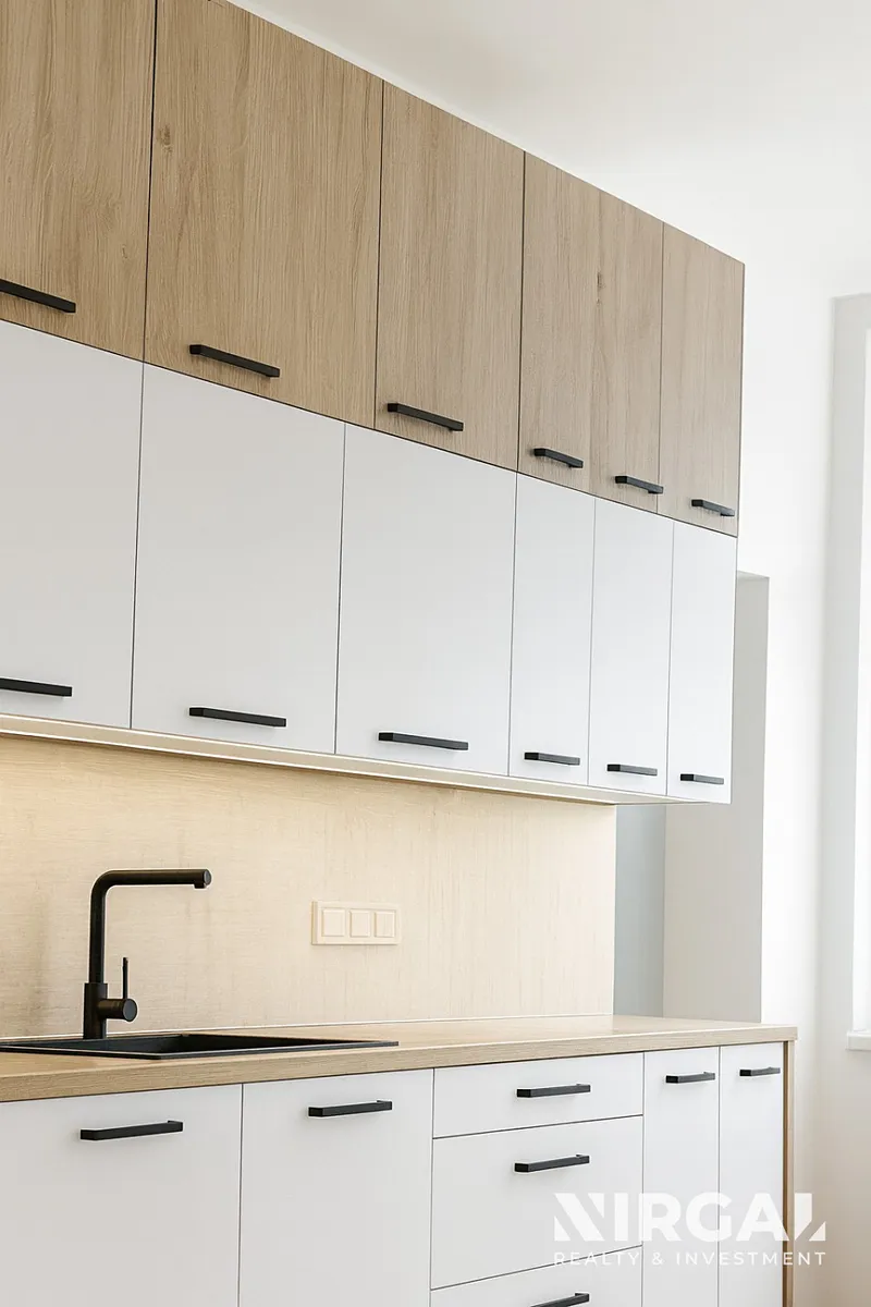 Interiér velmi prostorného obývacího pokoje, laděný ve světlých tónech, působí elegantně a vzdušně a nabízí harmonický prostor s dostatkem denního světla. Otevřená kuchyň je propojena s obývacím pokojem a ložnicí orientovanou do klidné ulice, což zajišťuje maximální soukromí. Oba pokoje jsou vybaveny elegantní parketovou podlahou, která interiéru dodává noblesní charakter. Byt je částečně vybavený – součástí je nová kuchyňská linka se spotřebiči (trouba, digestoř, varná deska, myčka, lednice). V koupelně se nachází sprchový kout, toaleta, podlahové vytápění a moderní žebříkový radiátor. Součástí vybavení je také pračka.