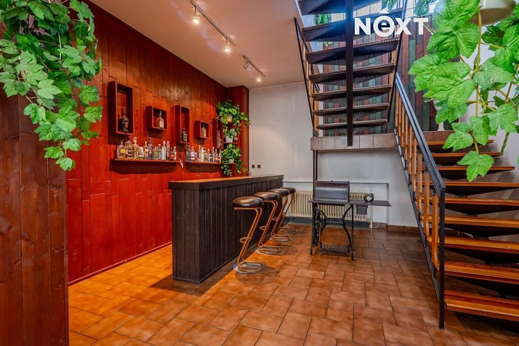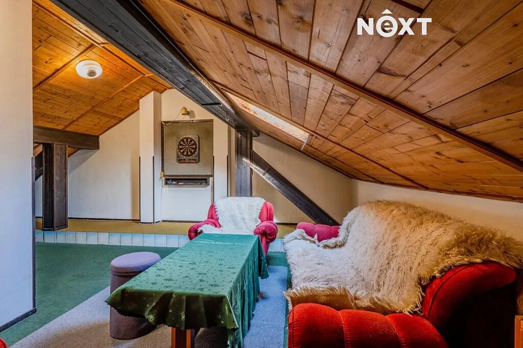 Celé druhé nadzemní podlaží bylo v roce 1990 nově přistavěno na stávající jednopodlažní dům a tím vznikla úctyhodná celková užitná plocha domu, která činí cca 310 m2. V tomto 2. podlaží se nachází pěkný prostorný byt o dispozici 4+1. Středová chodba (12,7 m2) v bytě umožňuje vstupy do jednotlivých samostatných pokojů (16,5 m2 a 12,7 m2), do ložnice (11 m2), obývacího pokoje (23,2 m2) s balkonem (7,3 m2), kuchyně (20,1 m2). Dále se na tomto podlaží nachází koupelna (11,6 m2) s dvojumyvadlem, vanou a sprchovým koutem, samostatná toaleta (1,6 m2) a komora (2,77 m2). Malé překvapení čeká v podkroví v podobě herní místnosti (15 m2). K bytu náleží i vstupní hala (2x 19,5 m2) se schodištěm, barem a krbem, která je umístěna v 1. NP a tvoří vstup do tohoto bytu.