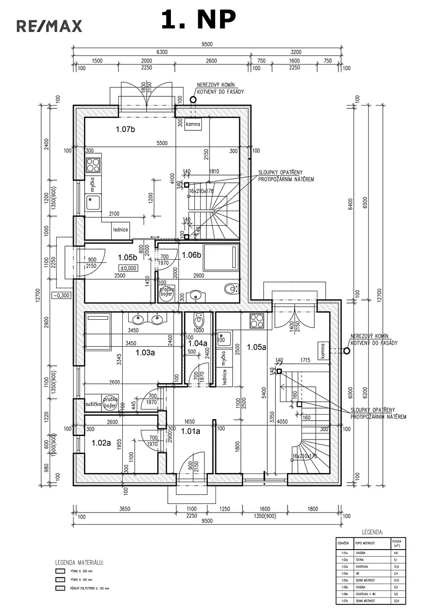 Charakteristika hlavní budovy: Jedná se o zděnou dvoupodlažní budovu bez podsklepení. Budova postavena z Ytong 30 cm + 15 cm zateplení bílý polystyren, dále nataženo do lepidla. Střešní krytina Mediterran - terran Zenit, vchodové dveře, okna a balkónové dveře zn. Veka. Vytápění a ohřev vody plánované elektřinou. Energetický průkaz budovy není k dispozici.