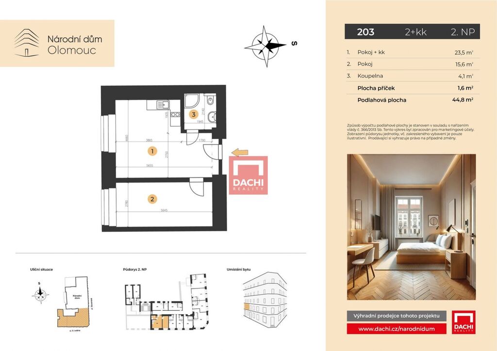 V rámci projektu nabízíme byt č. 203 o dispozici 2+kk s podlahovou plochou 44,8 m, který se nachází ve 2. nadzemním podlaží.