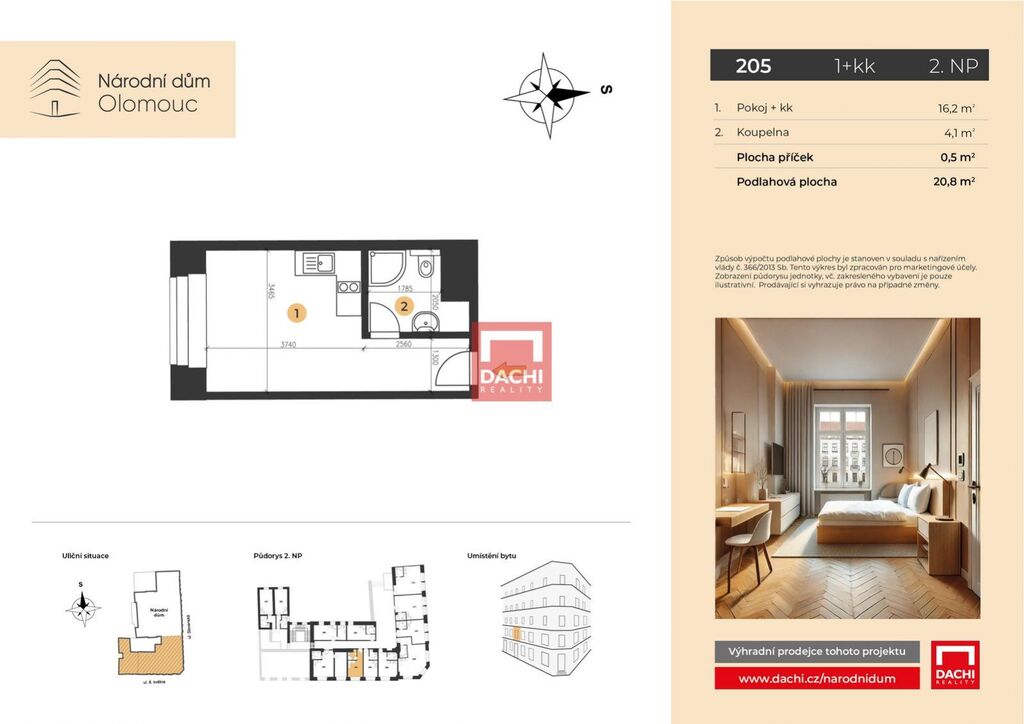V rámci projektu nabízíme byt č. 205 o dispozici 1+kk s podlahovou plochou 20,8m, který se nachází ve 2. nadzemním podlaží.