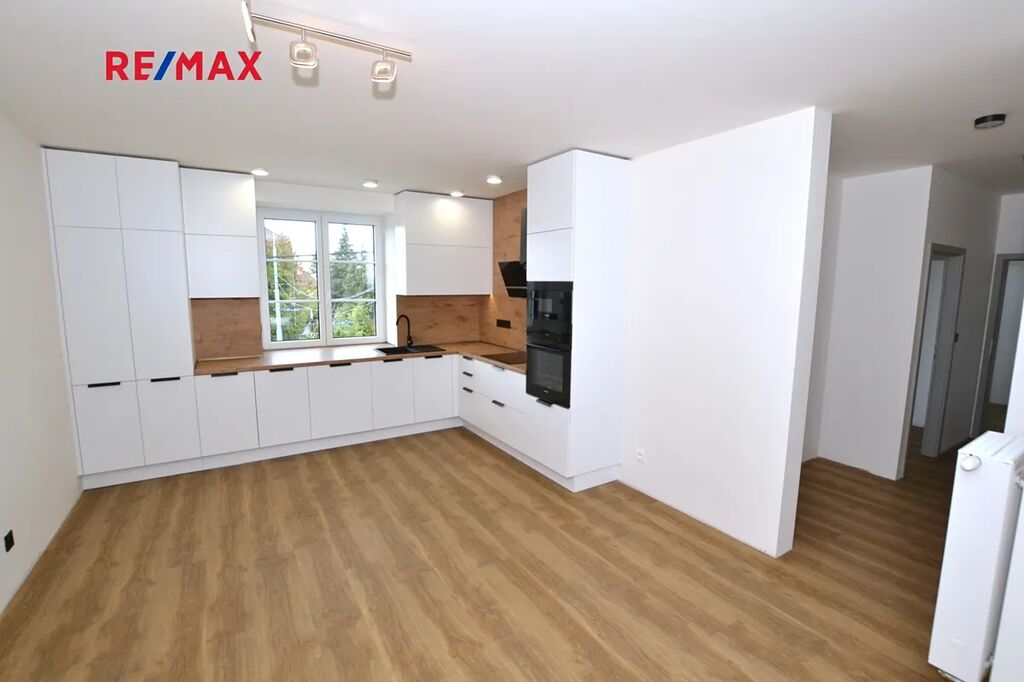 Byt čeká na svého prvního nájemce. Okna dvou pokojů a kuchyňského koutu jsou orientována na západní stranu, okna obývacího pokoje a ložnice s terasou na východní stranu do zahrady se vzrostlými stromy, kterou nájemce může využívat k relaxaci.