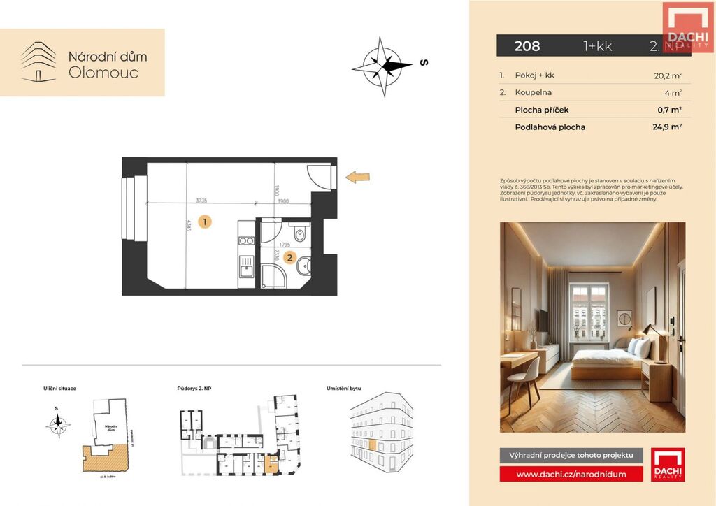 V rámci projektu nabízíme byt č. 208 o dispozici 1+kk s podlahovou plochou 24,9m, který se nachází ve 2. nadzemním podlaží.