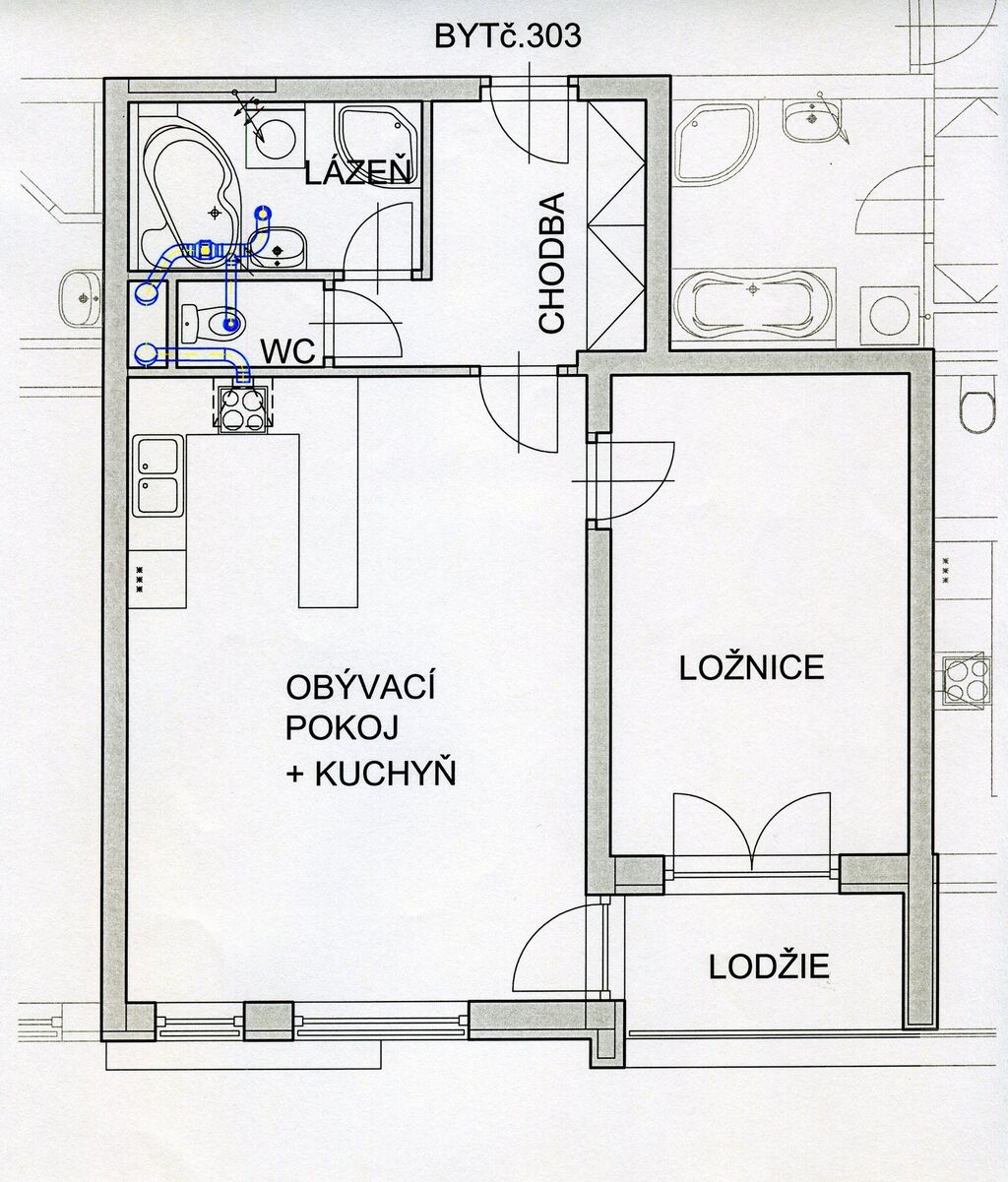 Lodžie je přístupná z obou pokojů. Byt je situován do klidného vnitrobloku, takže je zde klid i soukromí.