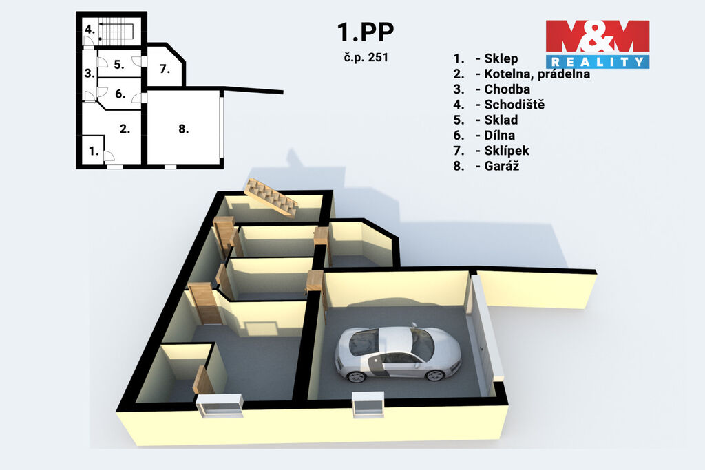 První dům, postavený v roce 1999, je podsklepený a dispozičně řešen jako 6+1 s užitnou plochou 193 m². V přízemí se nachází vstupní chodba se schodištěm, kuchyně, dva pokoje a koupelna s WC. V patře jsou čtyři samostatné pokoje, chodba, koupelna s vanou i sprchovým koutem a samostatné WC. V suterénu je garáž pro dvě vozidla. V roce 2023 byl instalován nový plynový kotel.