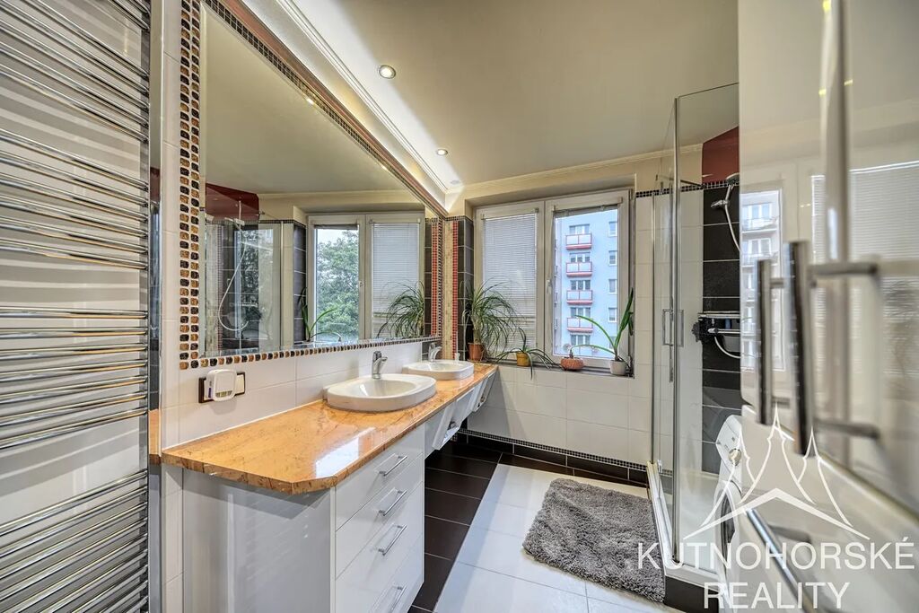 Koupelna – velký sprchový kout, dvě umyvadla a toaleta.