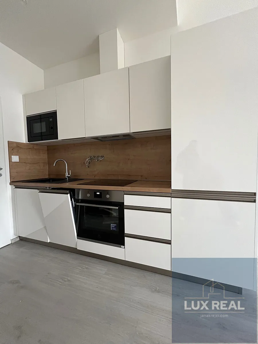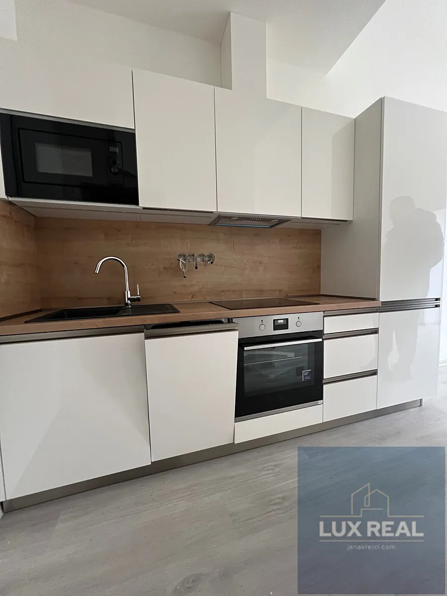 V bytě je komplet vybavená kuchyňská linka (indukce, mikrovlná trouba, elektrická trouba, myčka, lednice s mrazákem), jinak je