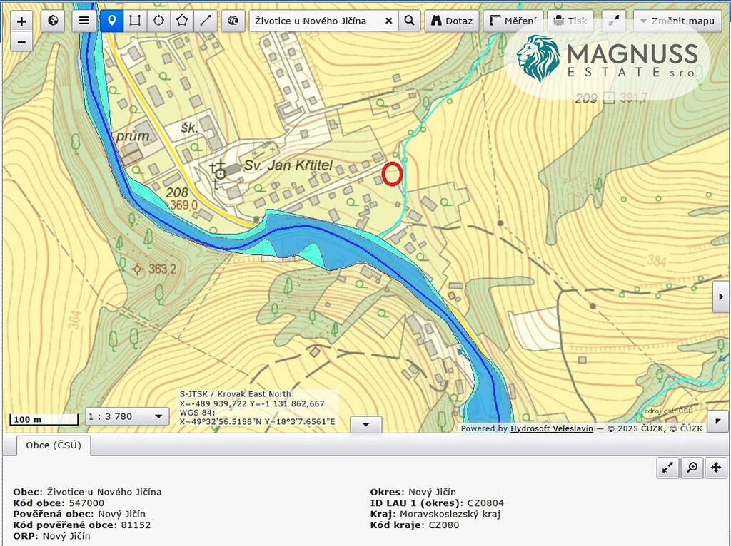 Pozemek o výměře 1 977 m² se nachází v klidné části obce, na konci slepé ulice, což zaručuje naprosté soukromí a minimum dopravního ruchu. Přes parcelu protéká malý potůček, který přirozeně rozděluje pozemek na dvě části – přibližně polovinu tvoří vzrostlé stromy, druhá část je určena pro výstavbu rodinného domu se zahradou. Tento přírodní prvek může být vnímán jako zajímavé zpestření, pro někoho naopak méně praktické. Pozemek se nenachází v záplavovém území viz fotografie.