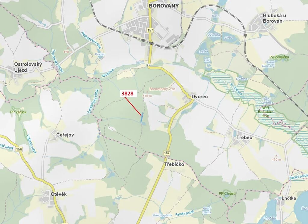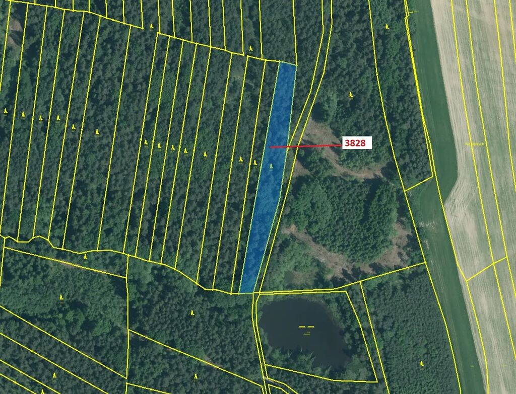Lesní pozemek o výměře 4 949 m2, parcelní číslo 3828, podíl 1/1, katastrální území Borovany, obec Borovany, obec s rozšířenou působností Trhové Sviny, okres České Budějovice, Jihočeský kraj. Po těžbě.