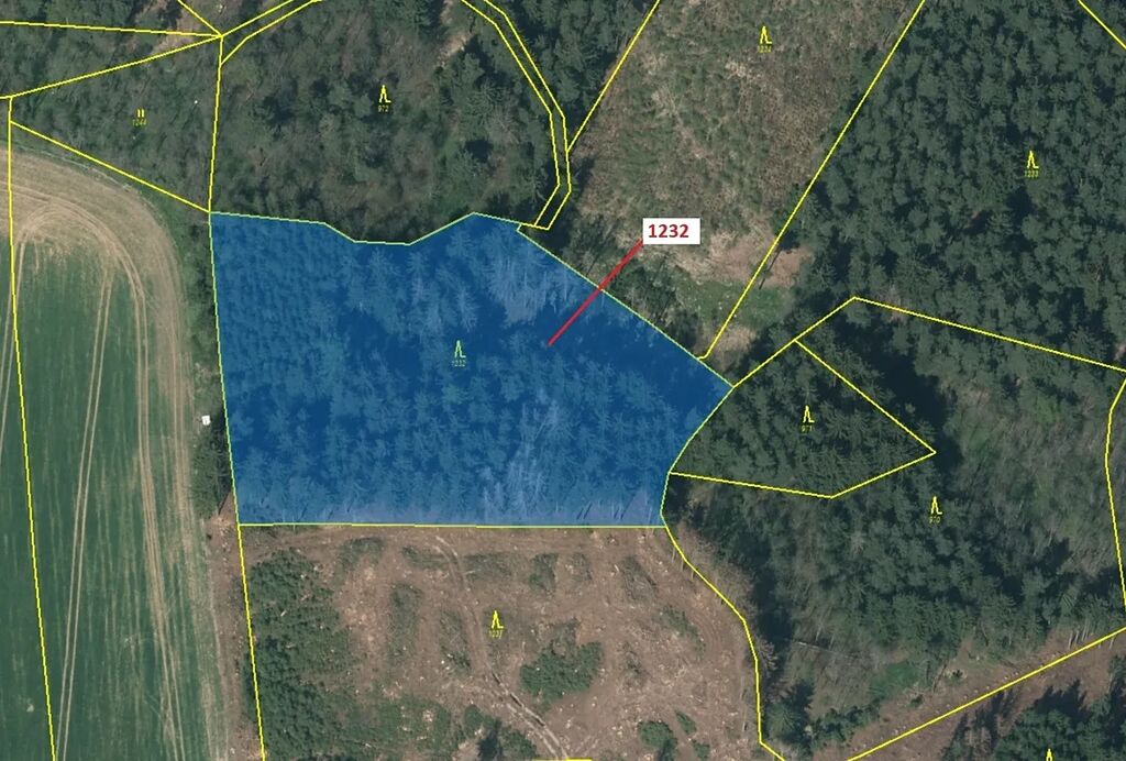 Lesní pozemek o výměře 8 672 m2, parcelní číslo 1232, podíl 1/1, katastrální území Chrbonín, obec Chrbonín, obec s rozšířenou působností Tábor, okres Tábor, Jihočeský kraj. Po těžbě.