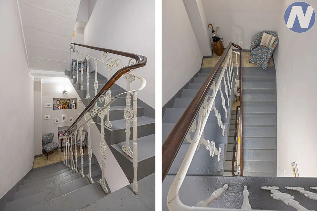 Mezi jednotlivými podlažími se vine krásné kamenné schodiště s kovaným zábradlím. Toto schodiště funguje jako tichý, elegantní přechod mezi vnitřními prostory.