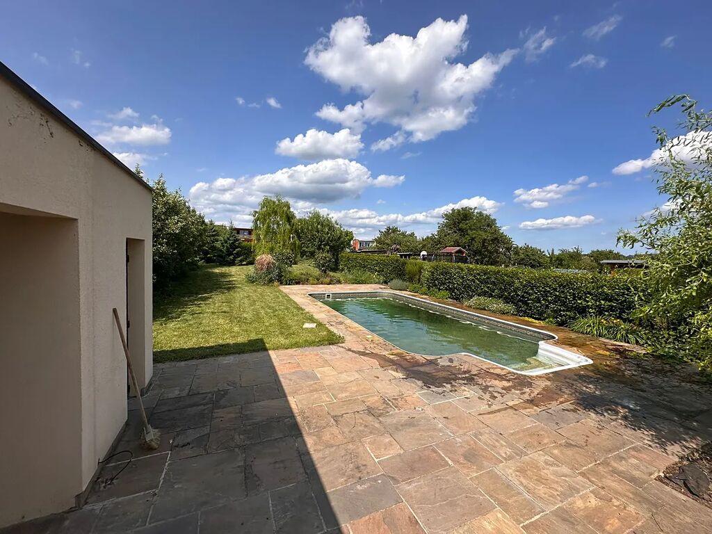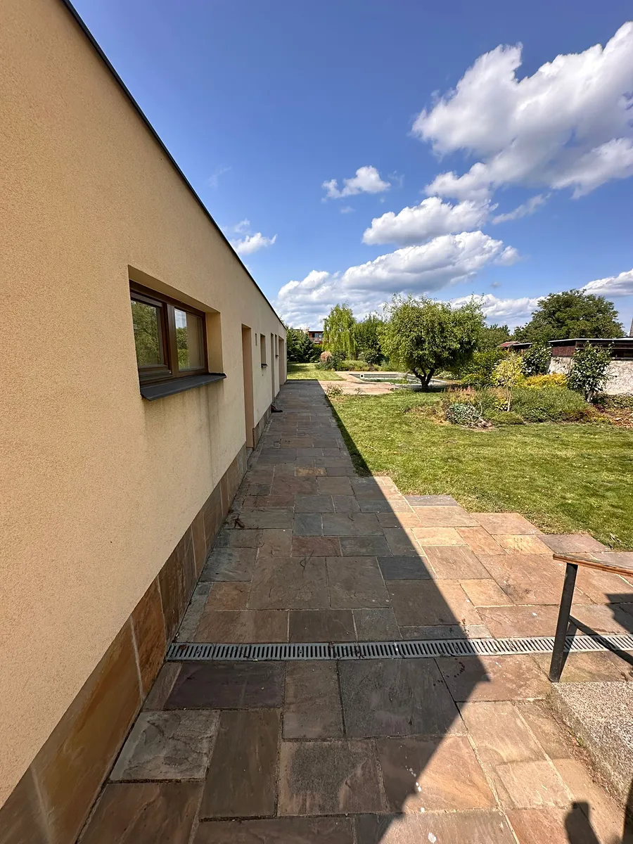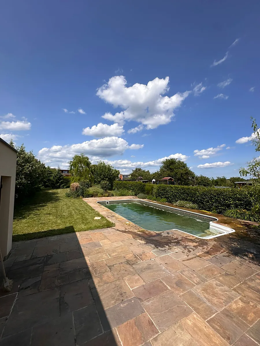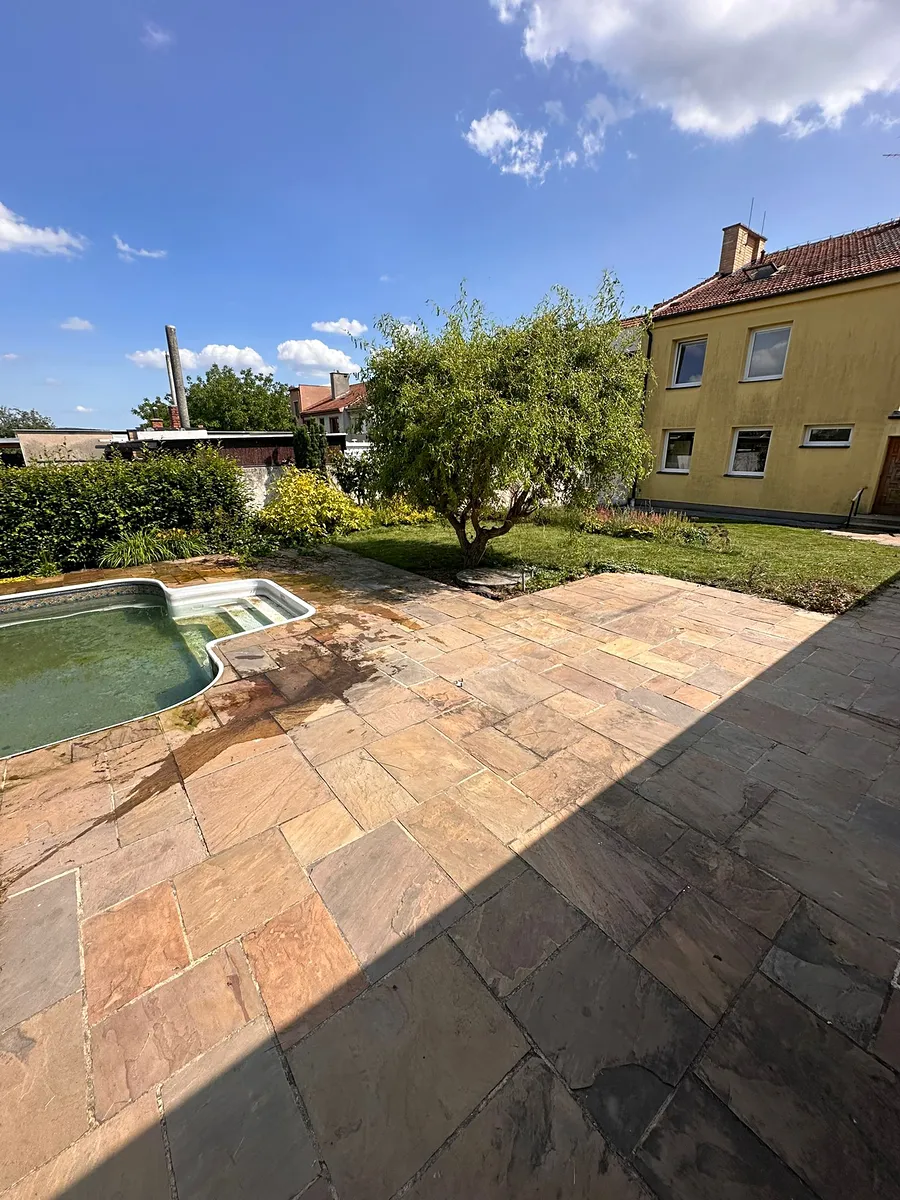 Na pozemku se nachází velká zahrada s bazénem, luxusní kamennou dlažbou a studnou na zalévání.