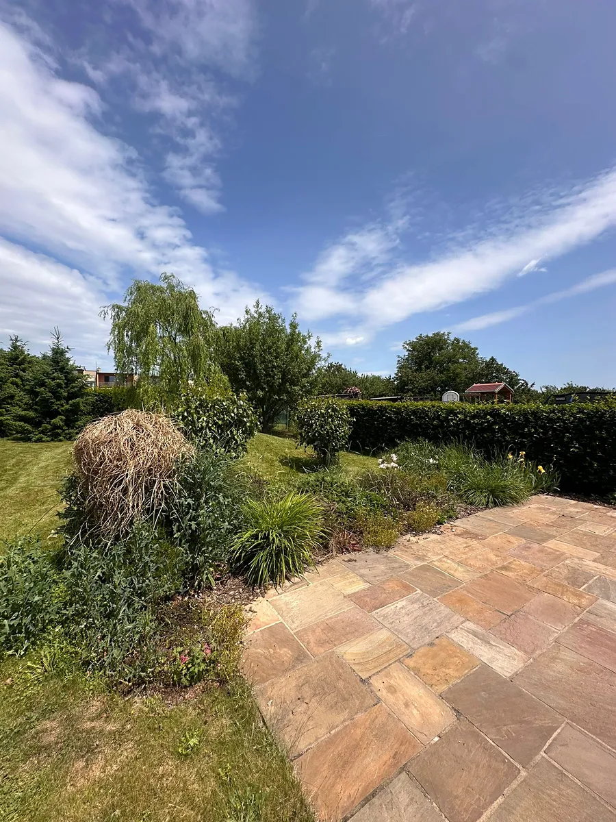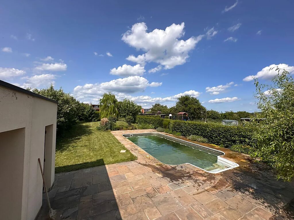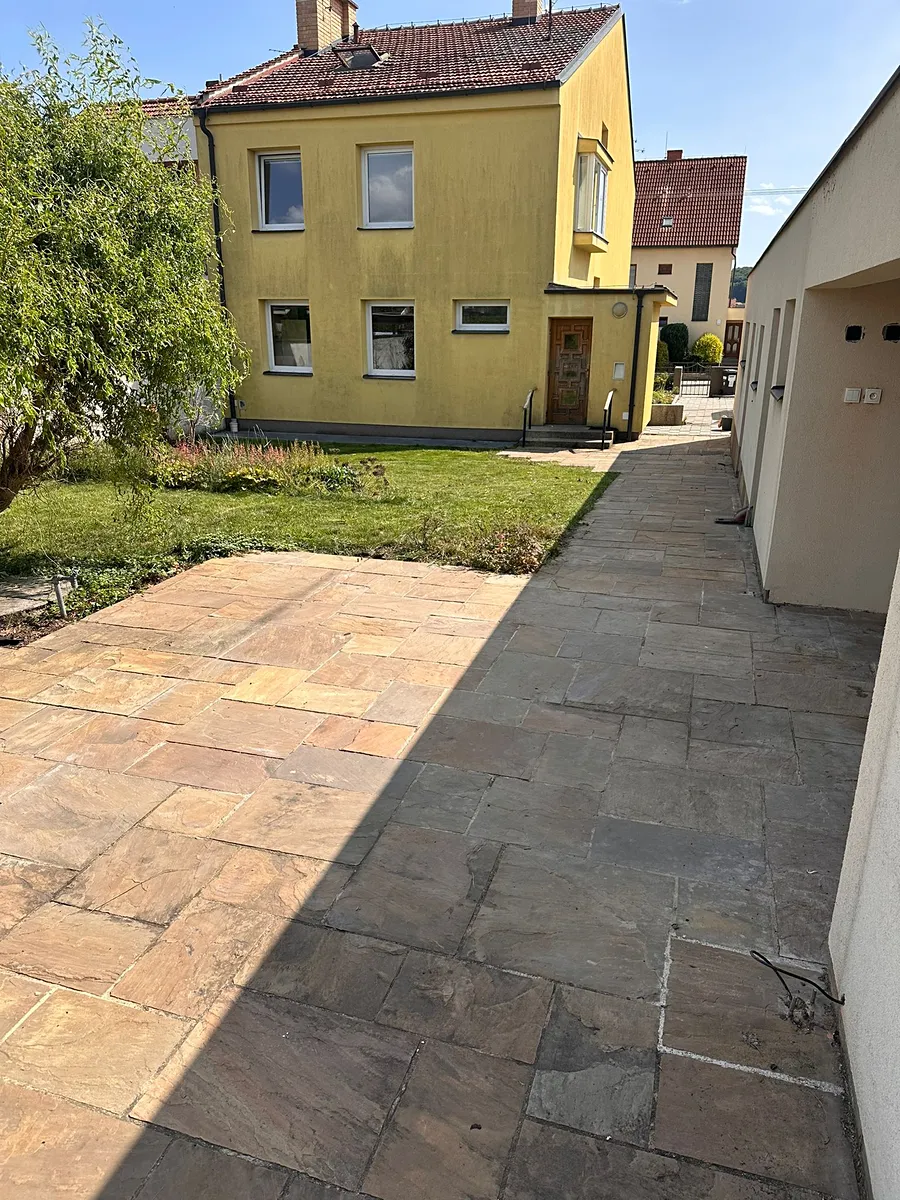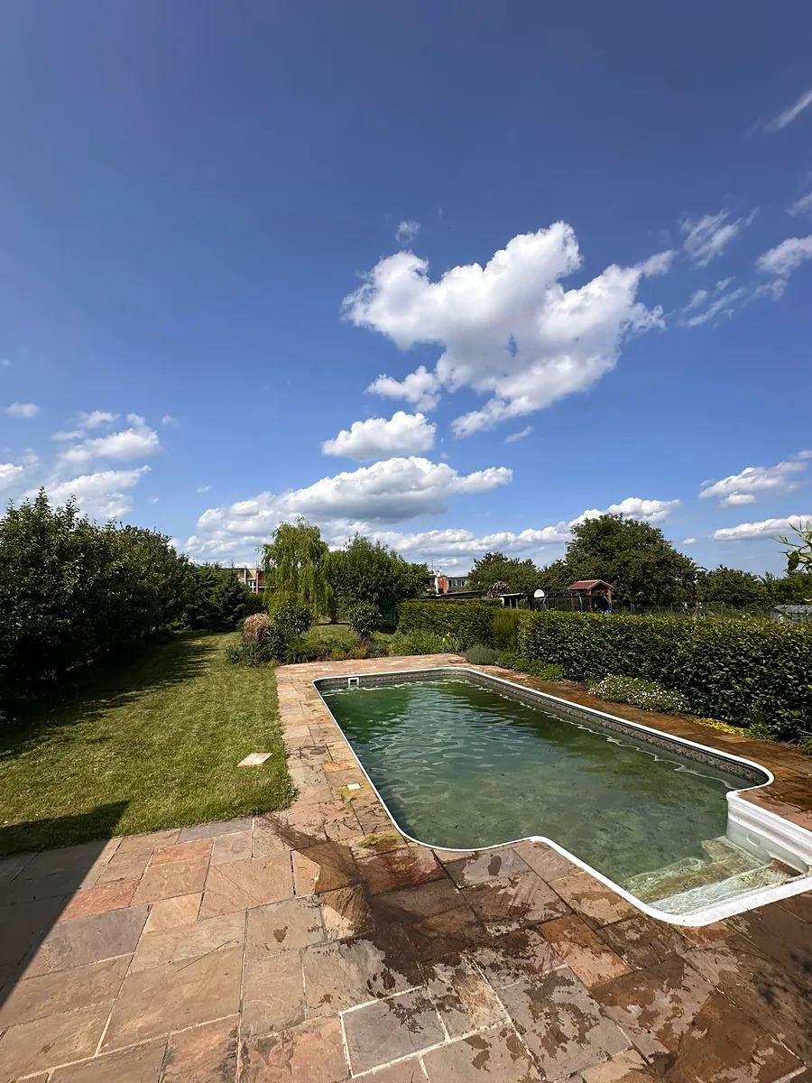 Na pozemku se nachází velká zahrada s bazénem, luxusní kamennou dlažbou a studnou na zalévání.