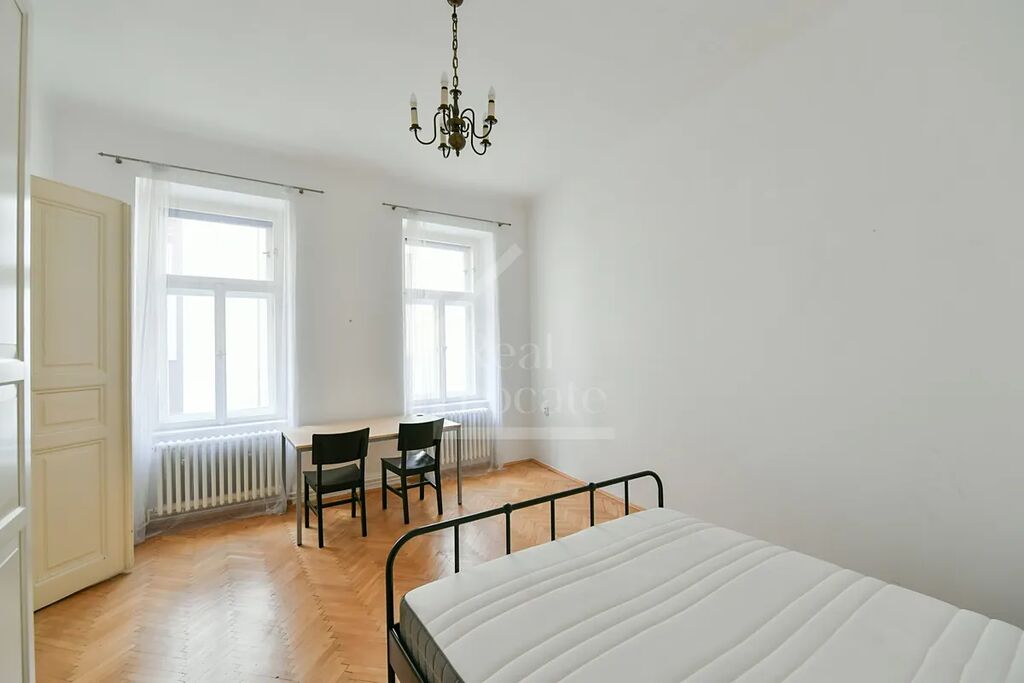 • tři samostatné prostorné pokoje s vysokými stropy a parketovými podlahami