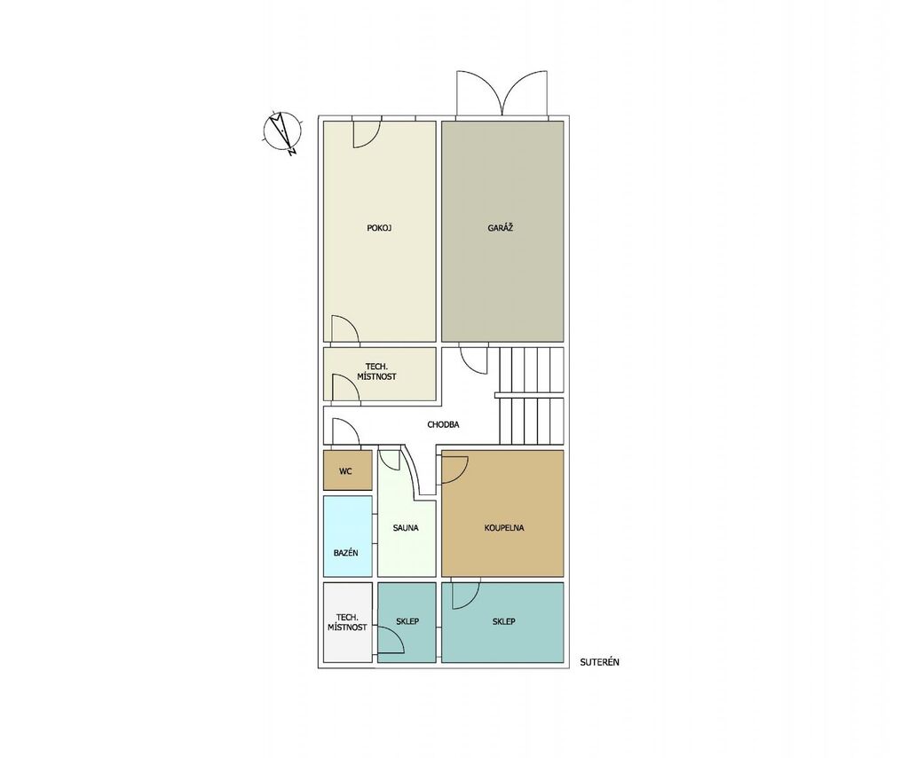 Suterén zahrnuje velkou garáž, 2 sklepy, 2 technické místnosti, prostor s přípravou pro saunu s ochlazovacím bazénkem, wc, koupelnu, pokoj se vstupem na zahradu za domem.