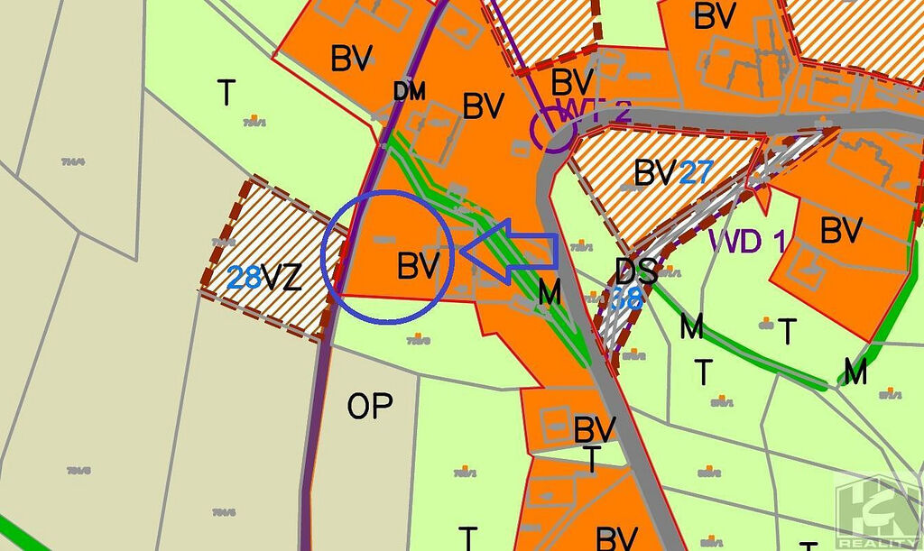 Pozemek je dle územního plánu charakterizován jako plocha BV venkovská obytná zástavba smíšená. Podmínky prostorového uspořádání umožňují výstavbu domů s 1 až 2 nadzemními podlažími, přičemž je možné zřídit podsklepení a podkroví. Důležité je dodržet maximální koeficient zastavění pozemku KZP = 0,30 a intenzitu využití pozemku s minimálním koeficientem zeleně 0,45.