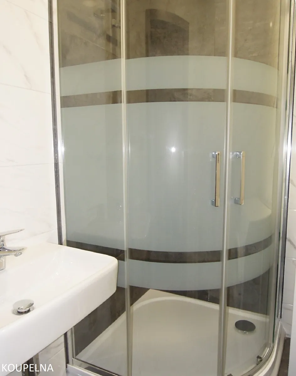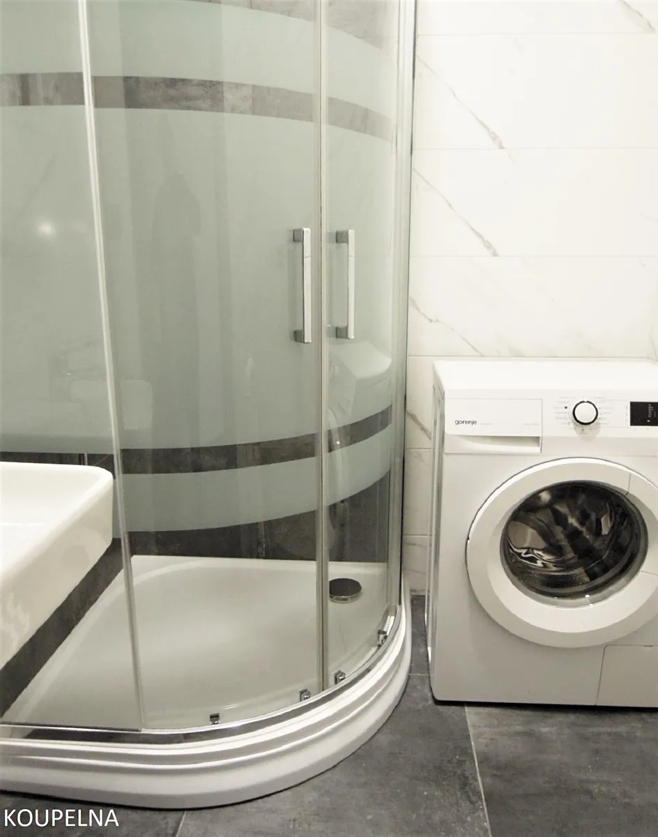 Koupelna má vstup z předsíně, je vybavená sprchovým koutem, umyvadlem a pračkou. WC je samostatné-viz půdorys. Okna jsou plastová.