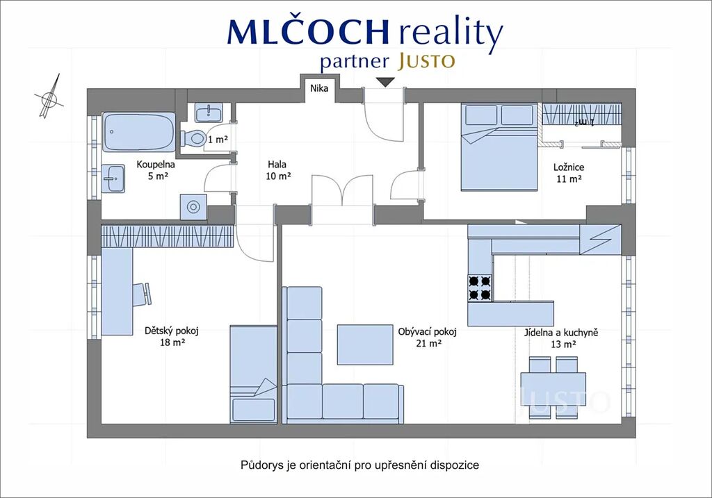 - 1. ložnice jako dokonalý dětský pokoj s třílůžkovou palandou (jedno lůžko vysouvací), psacím stolem a vestavěnými úložnými prostory, vše vyrobeno zakázkově na míru